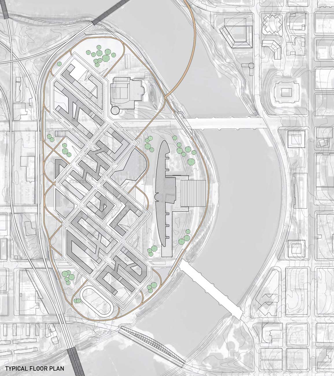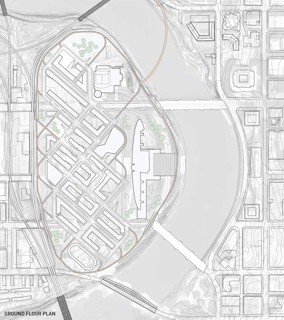 With businesses, sporting venues, and cultural attractions all within a short ride or walk from the neighborhood, The district is designed to optimize conditions for bicyclists. Direct bike lanes connect to downtown for commuters, meandering wooded lanes facilitate leisure riding, and a velodrome is available for serious racing. A bridge connects the neighborhood trails with the existing Olentangy River Trail. Once inside district boundaries, the bicycle trail is arrayed around the perimeter and through the interior of the development. Apartments and businesses on the site look out over green roads and trails rather than towards asphalt streets.