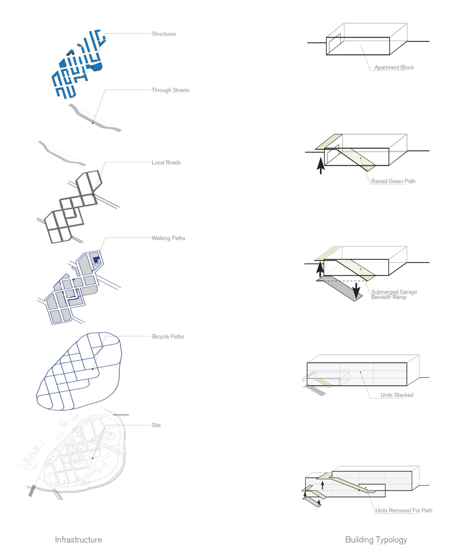 Although designed for bicycle commuters and pedestrians, Bicycle District accommodates vehicular traffic under modified conditions. Vehicular roads operate on the site only for necessary functions like emergency and municipal services. High-speed traffic is selectively filtered to the periphery while cars moving through the neighborhood interior operate only on specific roads at low speeds. The two high-speed roads running through the site are lowered below ground and bridged over, hiding traffic from view. Parking garages are located on the edges of the site and underneath apartment complexes. Bicycle District orients resident’s focus away from cars and parking and towards green spaces with accommodations for active commuting.