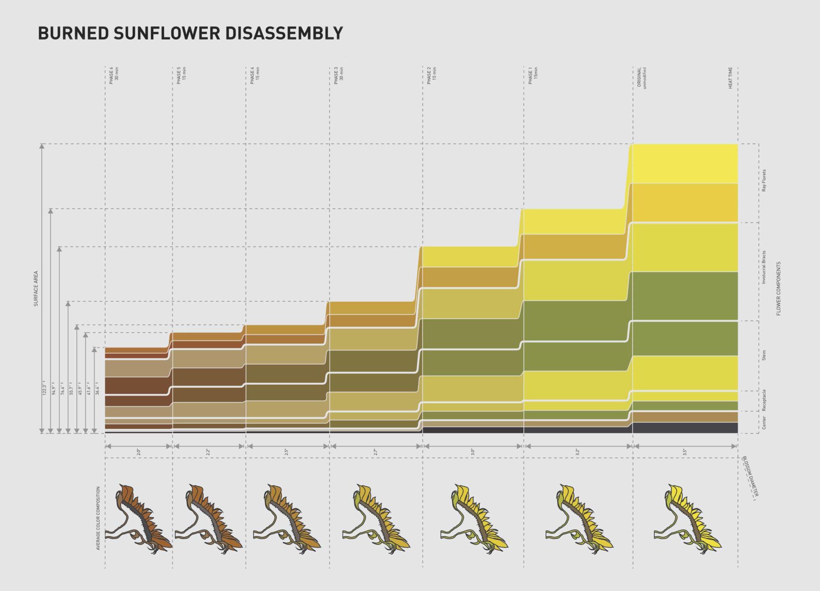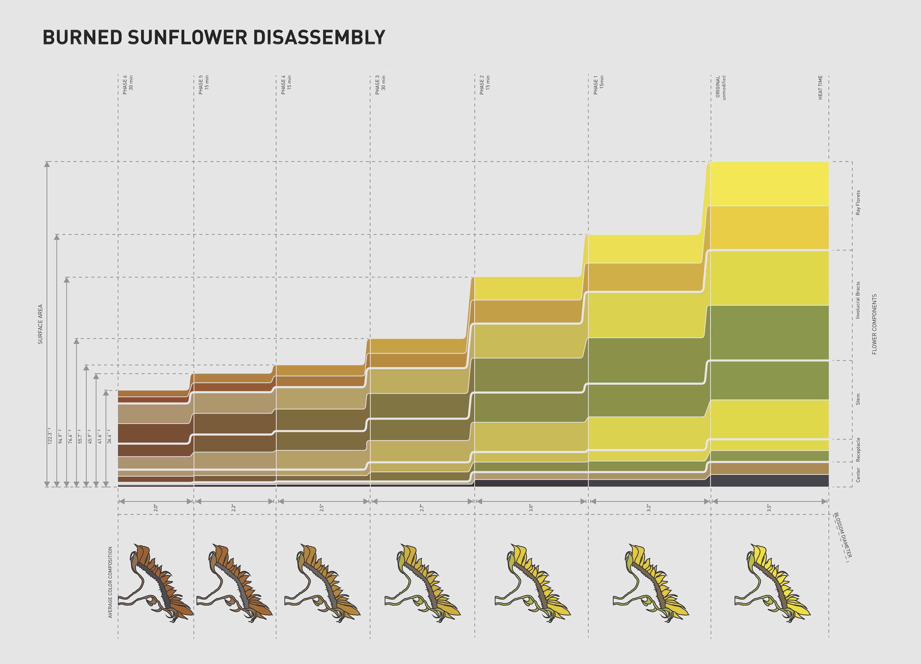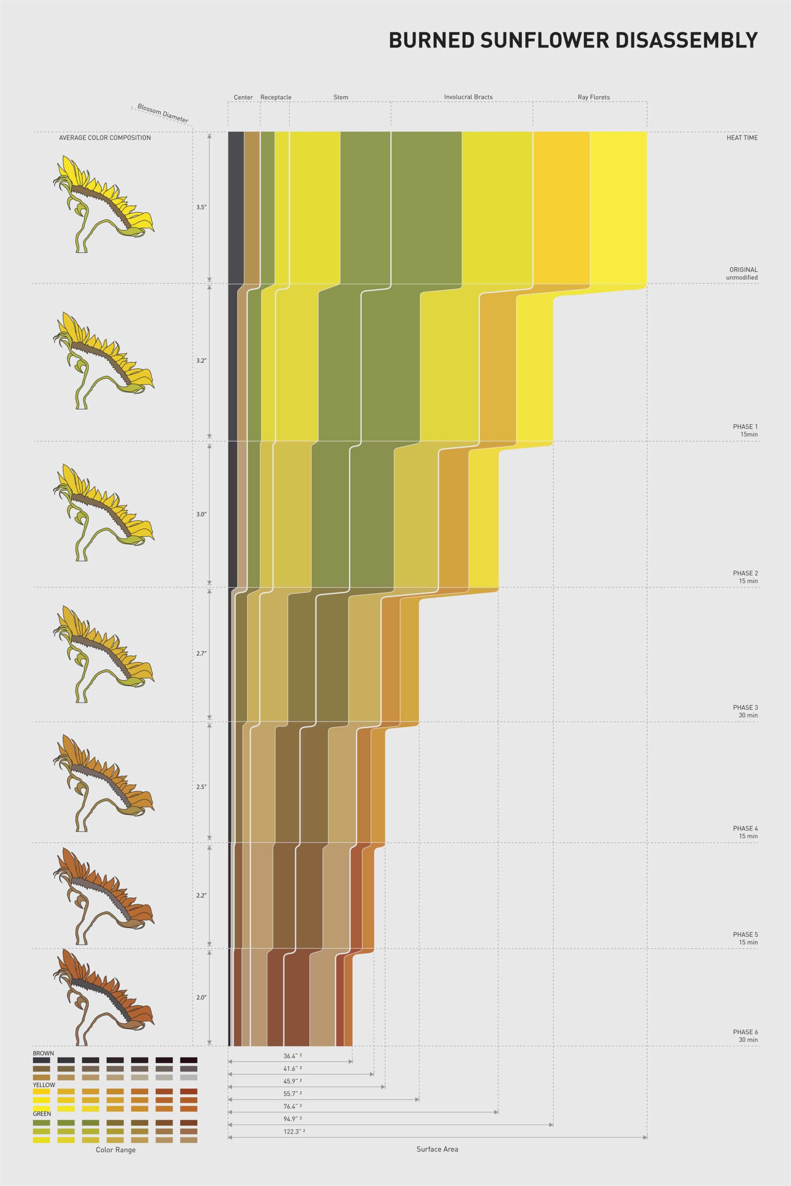 Burned Flower Disassembly is the first exercise assigned to me at Columbia University. We were given a sunflower and told to transform and document it in a manner of our choosing. I decided to incrementally cook the object in an oven and graph its subsequent changes in size and color. The graph itself is a nod to several of the artful diagrams of Edward Tufte and attempts to integrate as much information as possible into an all inclusive chart.