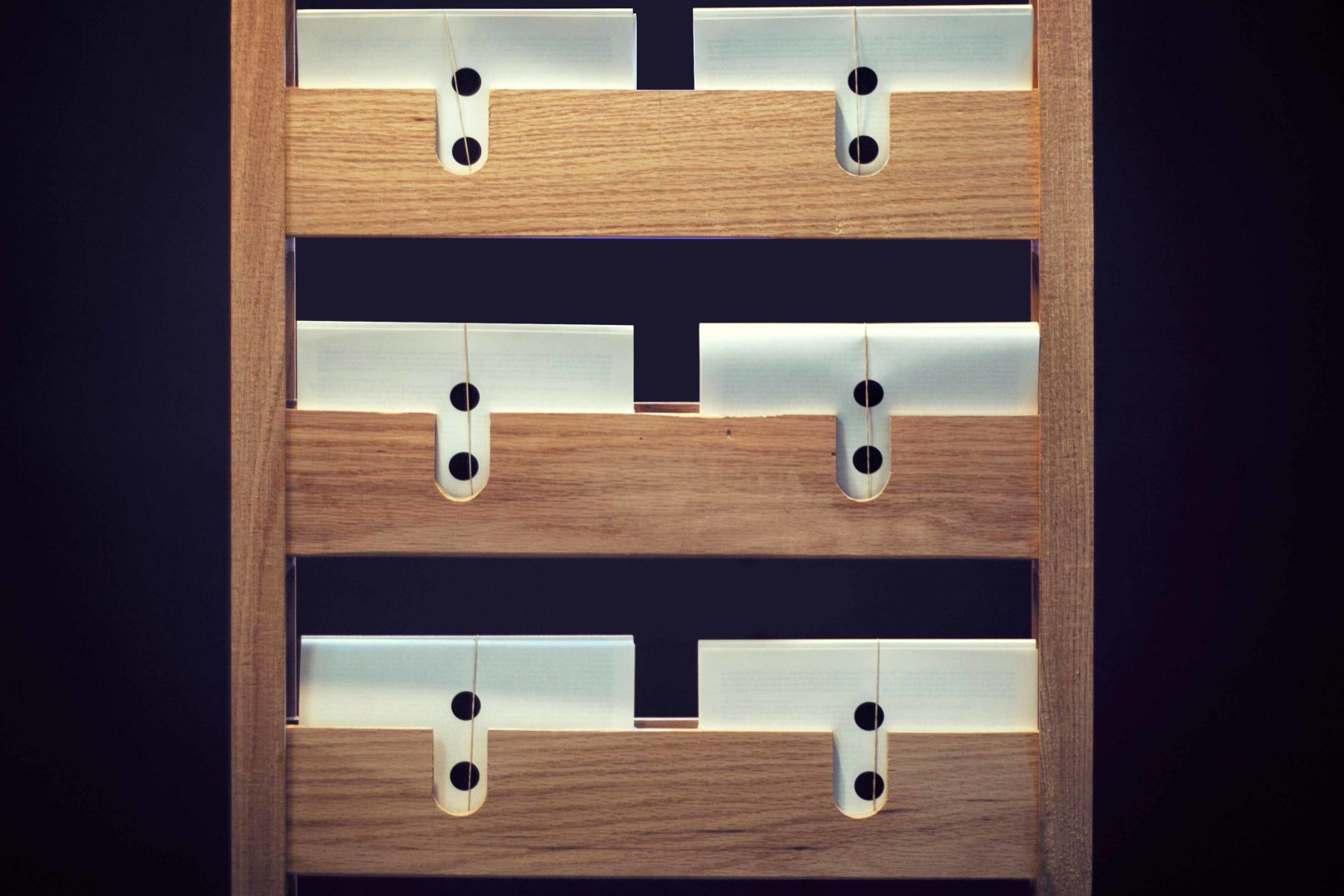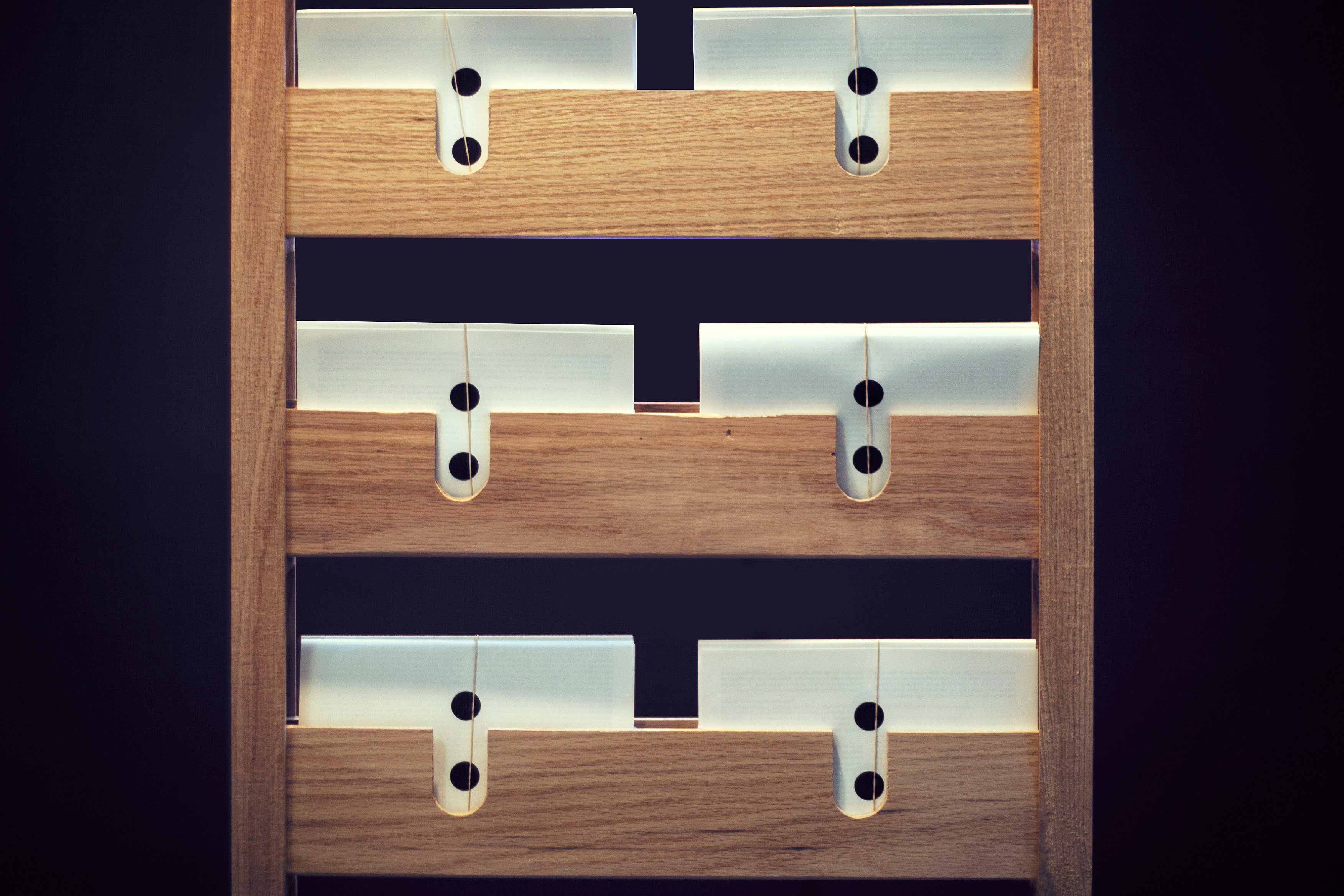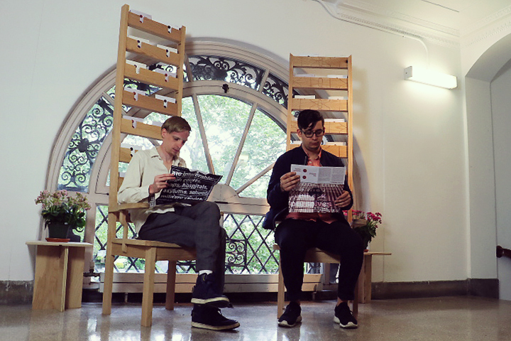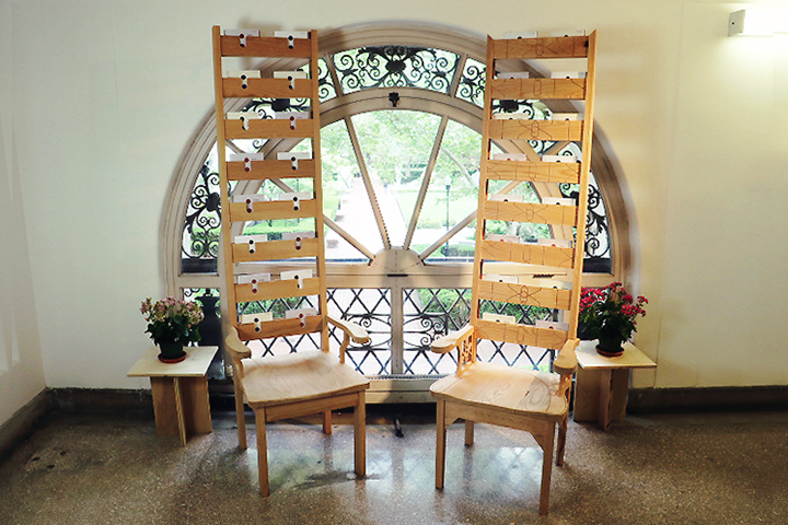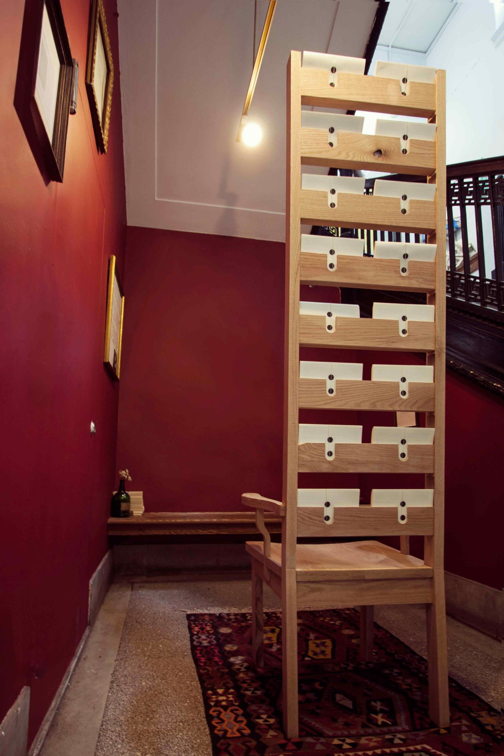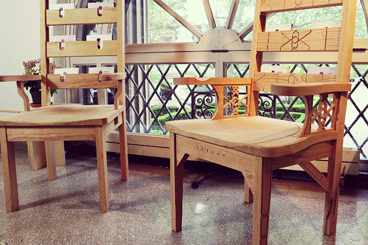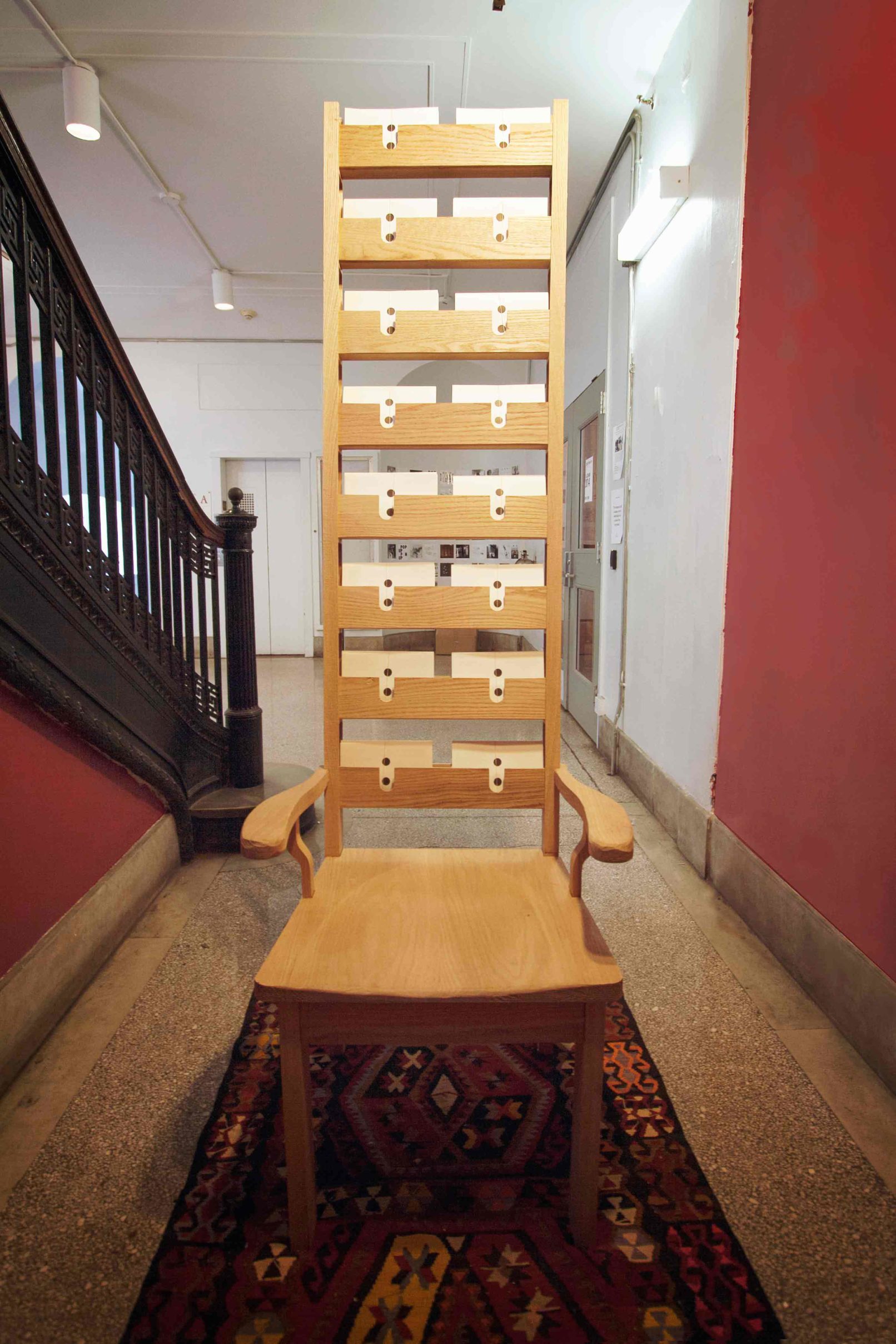 This installation was a one-year design collaboration. The student-led publication C-O-L-O-N was seeking a way to display is material at the yearly ‘End of Year Show’. We designed a single elongated display chair for the 2014 EOYS that would be paired with a second, similar yet distinct, brother the following year. The first chair was an elongated ladder chair built in a style reminiscent of an American Quaker design. The second chair, while similar in size and proportion, is more richly detailed with elements of Chippendale accents. Both chairs were constructed from red oak. The detailing choices on the chairs resulted from conversations with the magazine’s staff who thought the chairs should attempt to embody the ethos of the publication. Namely, the chairs should stimulate differing viewpoints and encourage dialogue stemming from the publication. Placing the chairs together encourages the user to pull out a magazine and sit and discuss its contents as a series of continuing arguments.