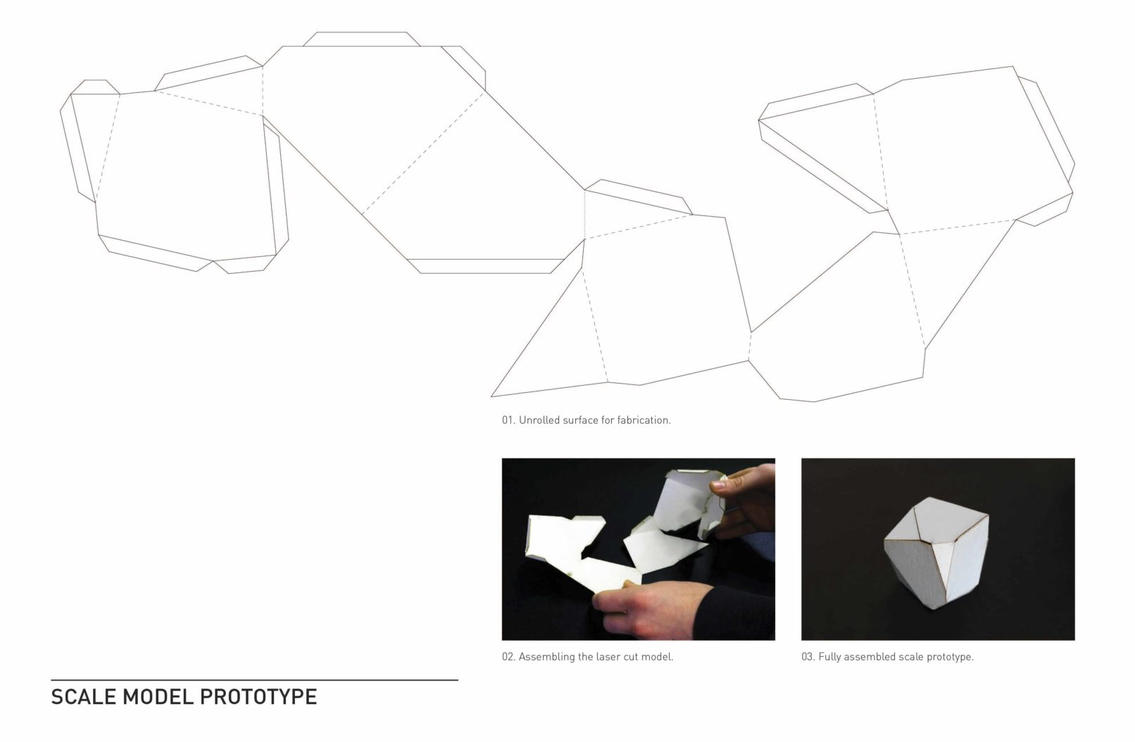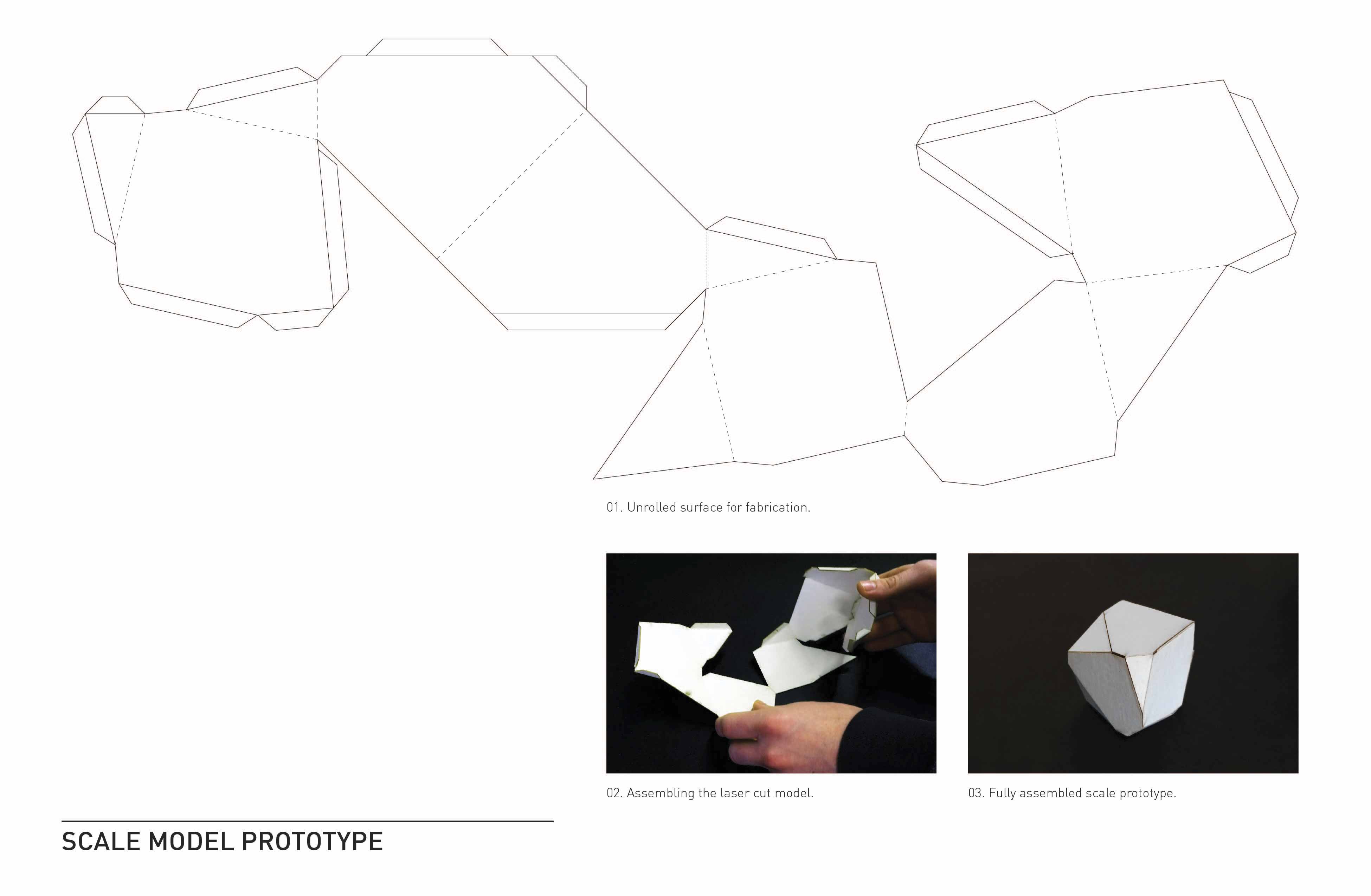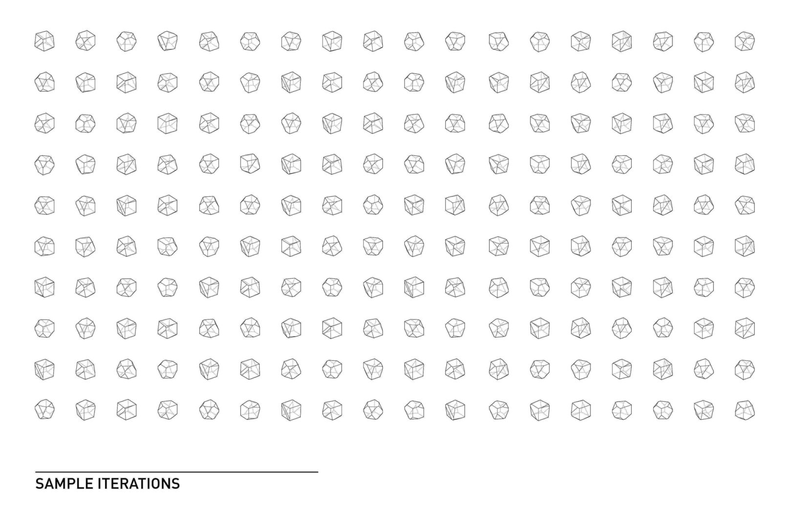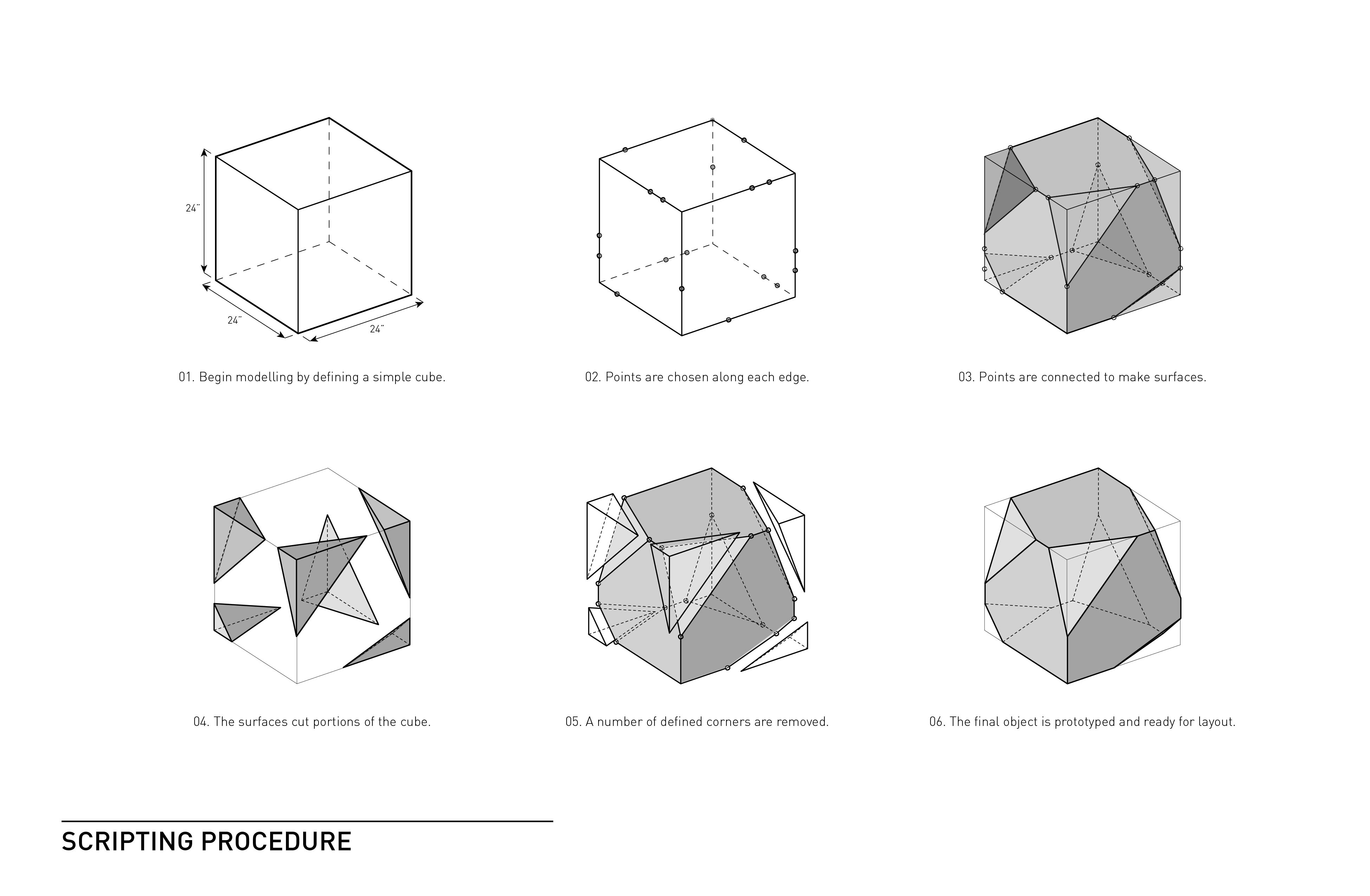 Computer scripting allows users to generate many iterations of a prototype from a limited set of instructions. Cube Chair is the result of my attempts to design a logic system rather than an object. Starting with a simple cube, the script incrementally cuts and carves corners to a variable magnitude and frequency. Given a limited amount of variables and constraints, the program is able to produce a nearly infinite amount of variations on the basic design. This script is further automated by implementing a timer component, courtesy of Giulio Piacentino, along with commands to move and sort the resulting shapes into a field. After selecting one of the digital prototypes; I unrolled the object, then fabricated and assembled a scale model.