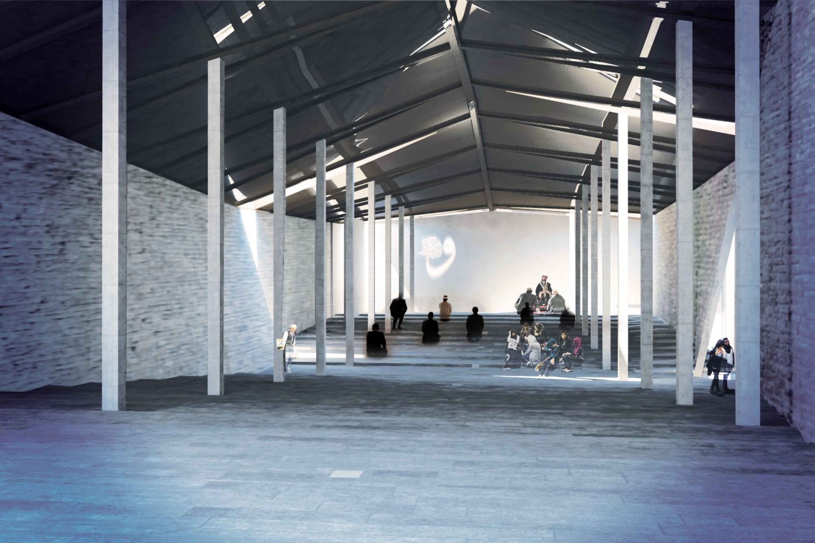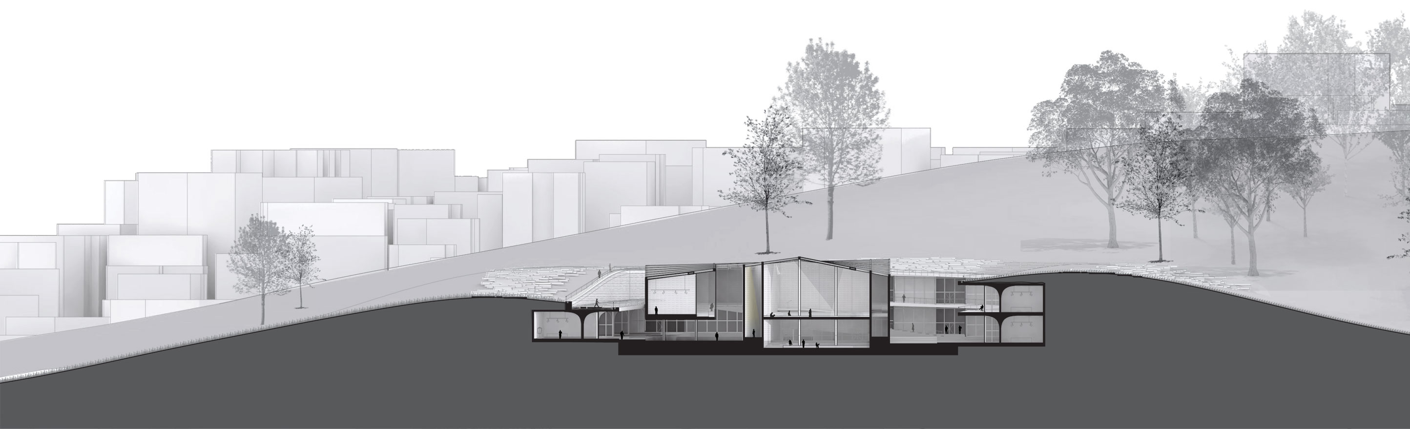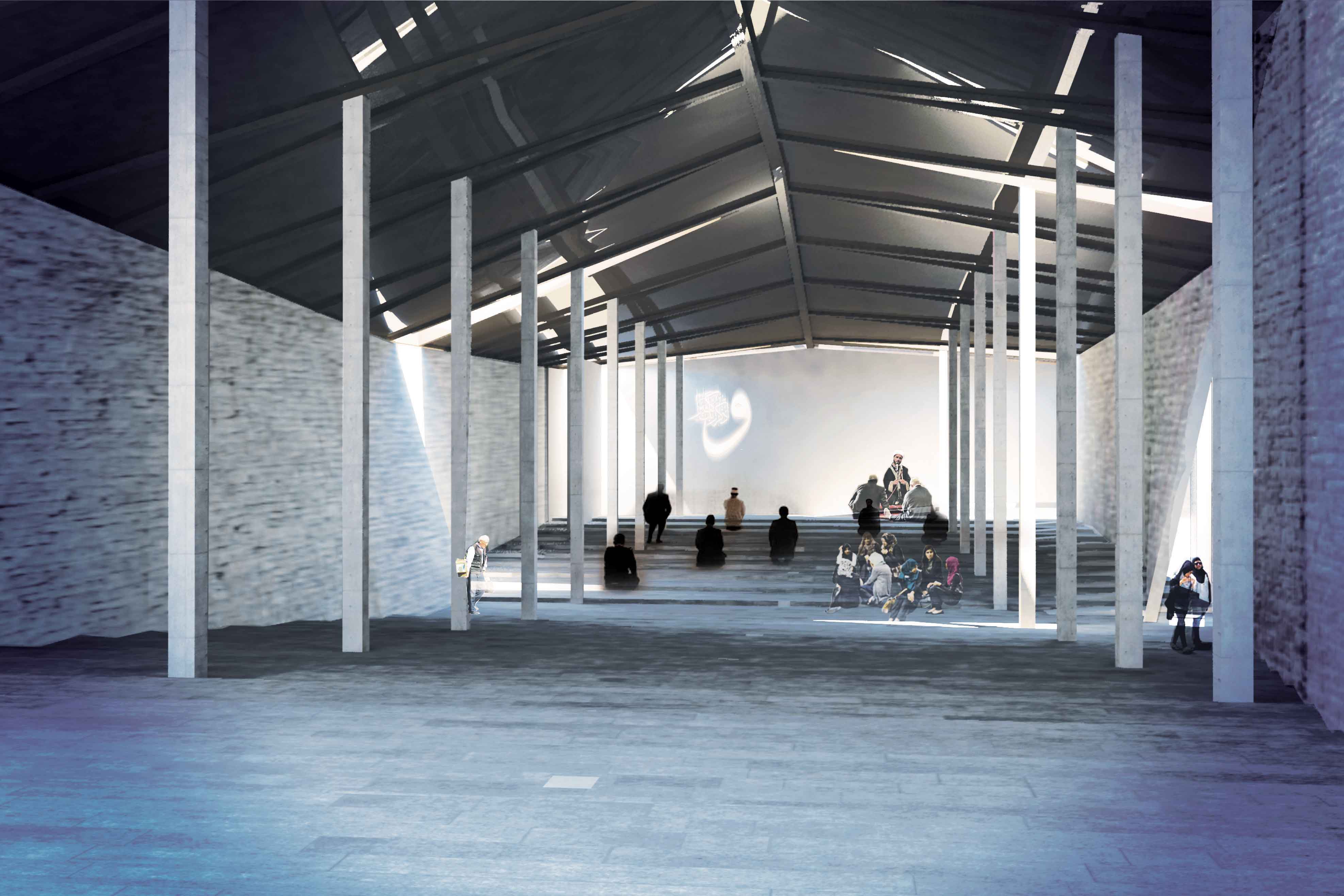 In Displaced/Replaced Mosque a rectangular volume of the hill is removed, then a rotated structure is placed in a skewed form across the excised void. Circulation and retail spaces are created in the skewed spaces surrounding the mosque. Rather than facing a single direction, the main hall of the mosque is organized like a stadium with seating facing both down and up when looking towards the quibla. The spaces created by the skewing of landscape and the organization of circulation allow for men and women to have equal entrance spaces while still maintaining a traditional separation. Circulation through the mosque is accomplished through a large monumental stair that arcs into the center of the mosque. This stair also allows users to navigate around the mosque without ever entering it if they wish. Retail is reintegrated into the form of the project in the form of a double tiered outdoor marketplace. The project tries to place a more appropriately scaled mosque back onto the site and then add useful function in an effort to circulate people through.