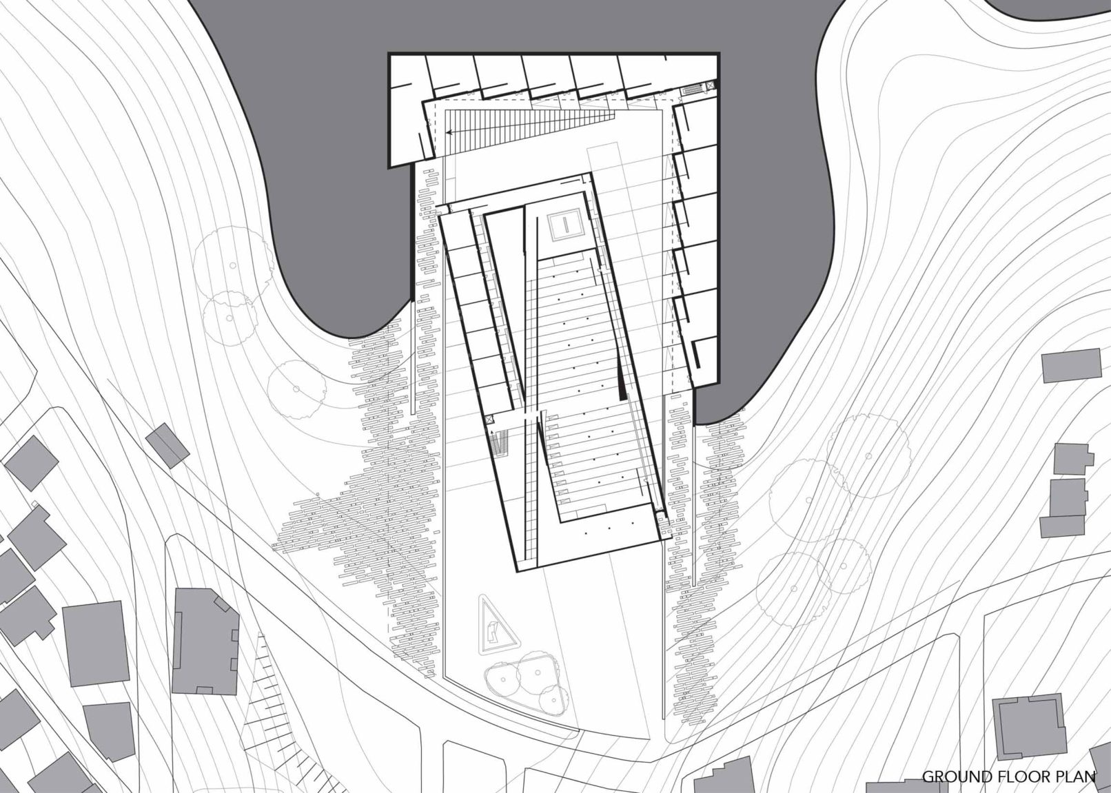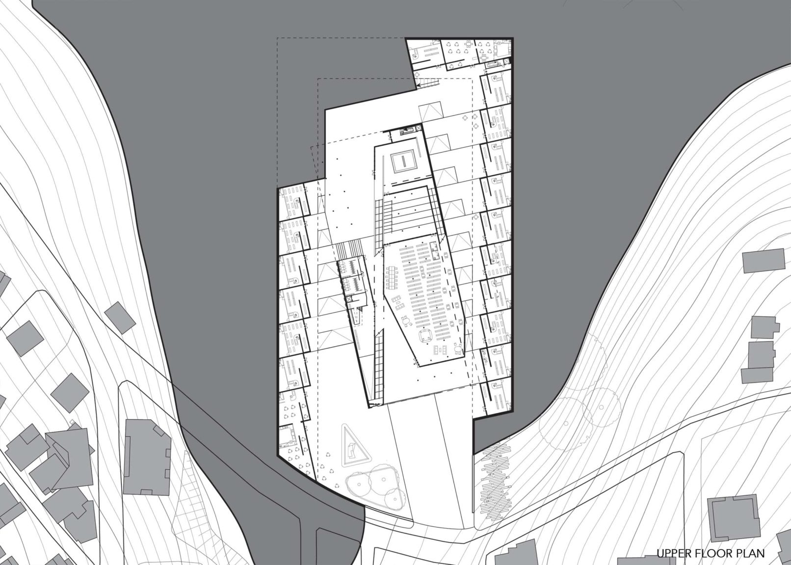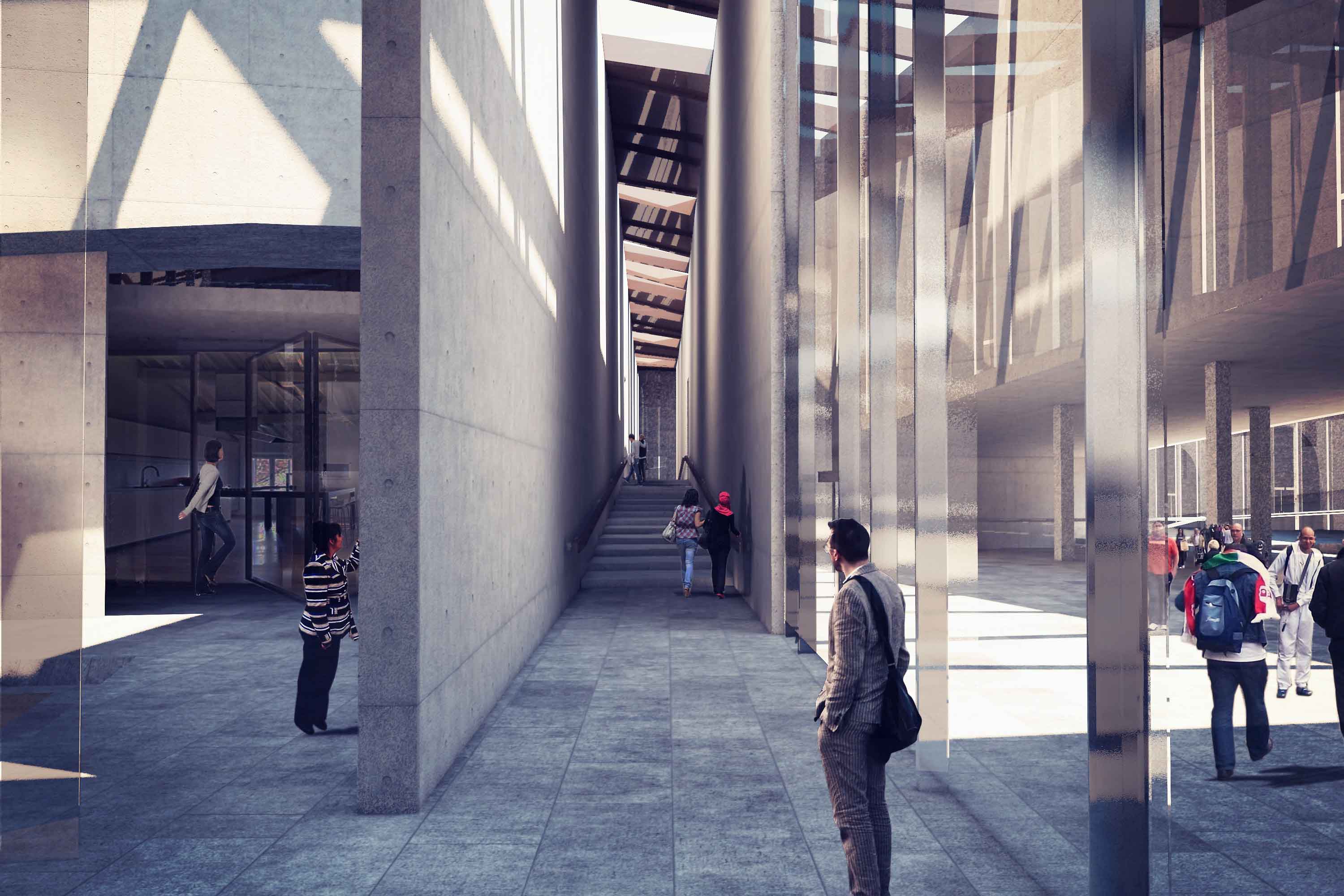 In Displaced/Replaced Mosque a rectangular volume of the hill is removed, then a rotated structure is placed in a skewed form across the excised void. Circulation and retail spaces are created in the skewed spaces surrounding the mosque. Rather than facing a single direction, the main hall of the mosque is organized like a stadium with seating facing both down and up when looking towards the quibla. The spaces created by the skewing of landscape and the organization of circulation allow for men and women to have equal entrance spaces while still maintaining a traditional separation. Circulation through the mosque is accomplished through a large monumental stair that arcs into the center of the mosque. This stair also allows users to navigate around the mosque without ever entering it if they wish. Retail is reintegrated into the form of the project in the form of a double tiered outdoor marketplace. The project tries to place a more appropriately scaled mosque back onto the site and then add useful function in an effort to circulate people through.