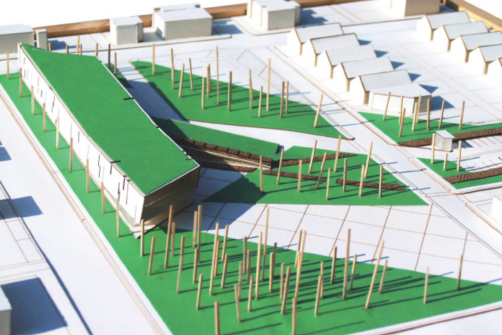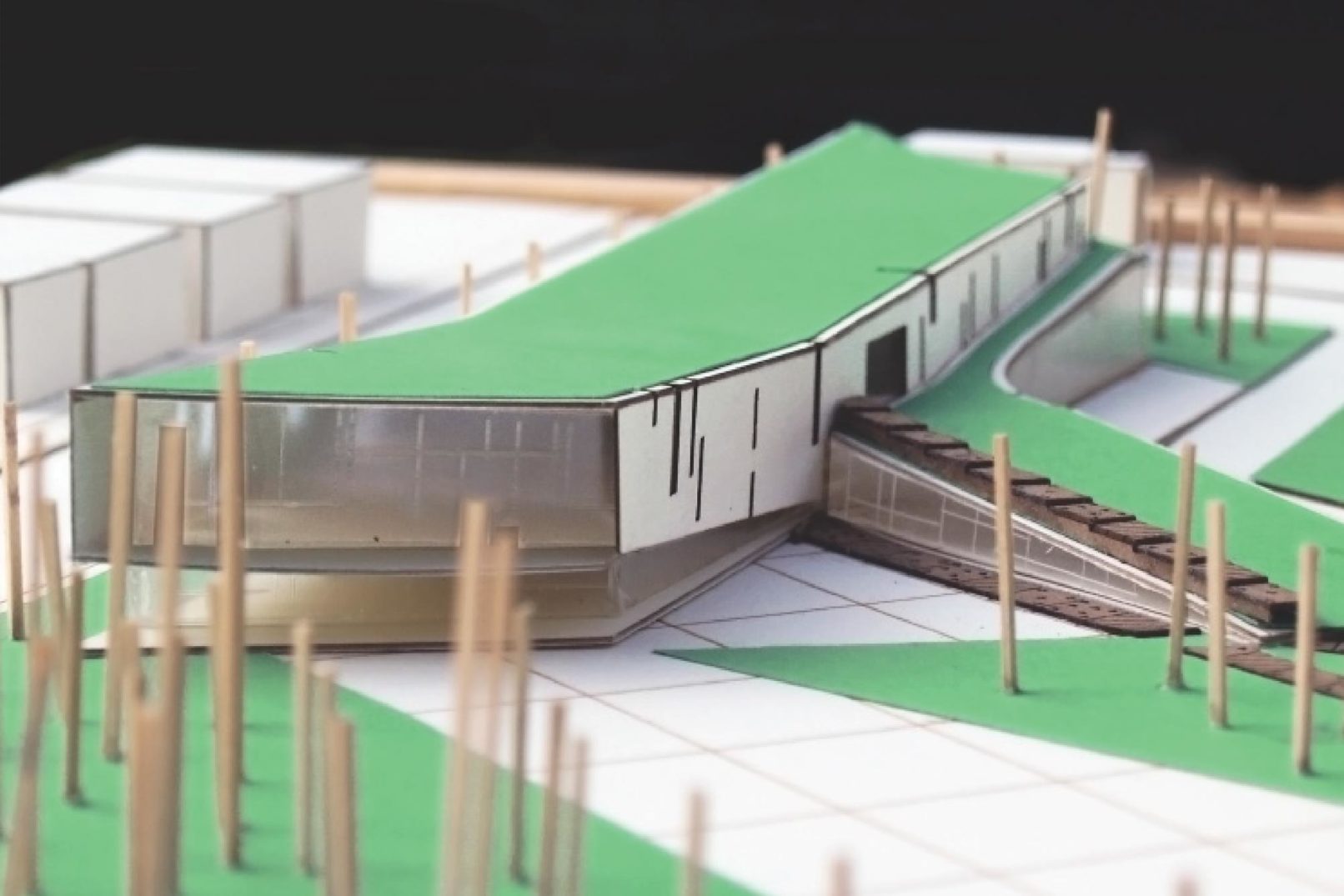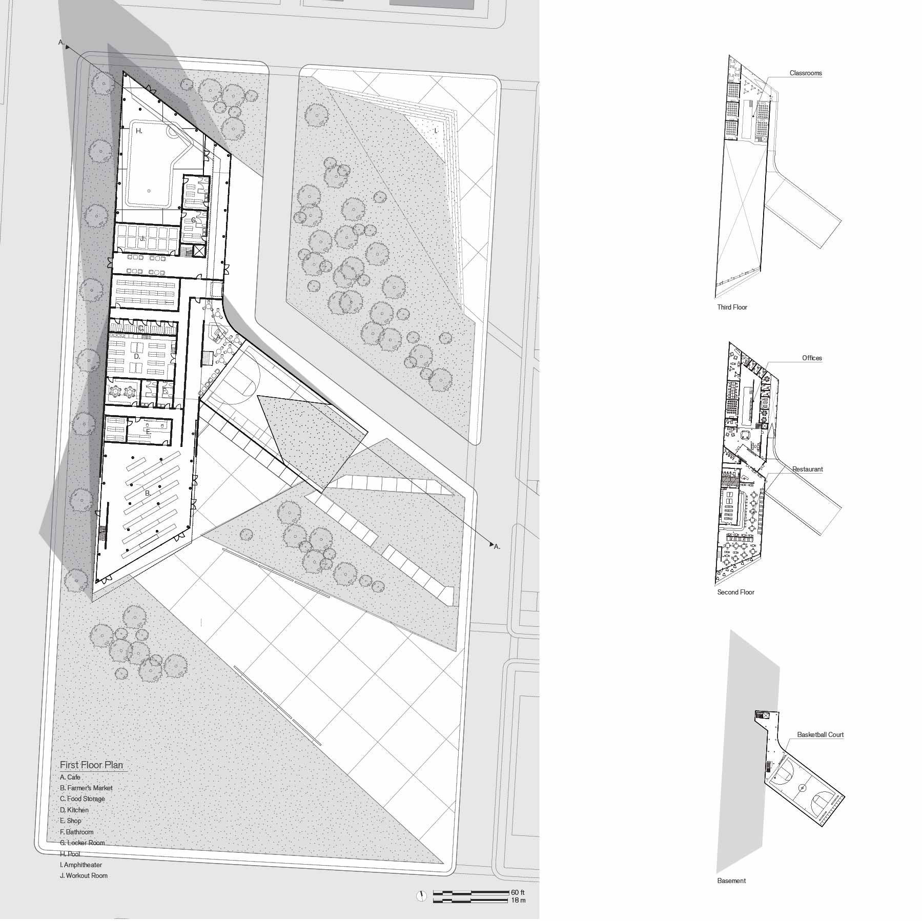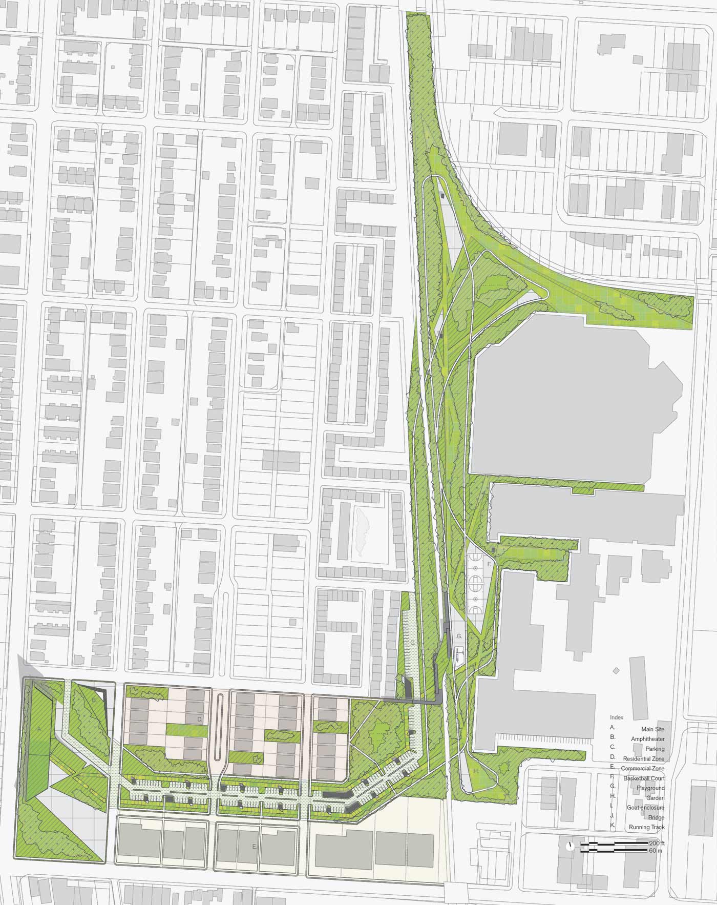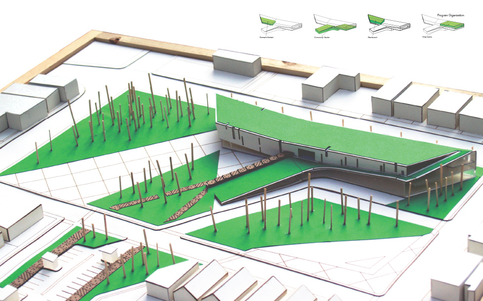 Farm/Forest is a two part design that considers the main structure individually and in relation to a greater urban plan. The urban plan takes advantage of the underutilized land surrounding railroad tracks on the eastern edge of the site. Program is divided between agricultural parcels, parks, and recreation space. Moving towards the main site the strands of agriculture and forest condense along Fifth Avenue and provide residents with individual plots and sheds for community gardening. Parking and individual pavilions are scattered throughout the site as smaller more intimate spaces that exist for Weinland Park residents to gather.