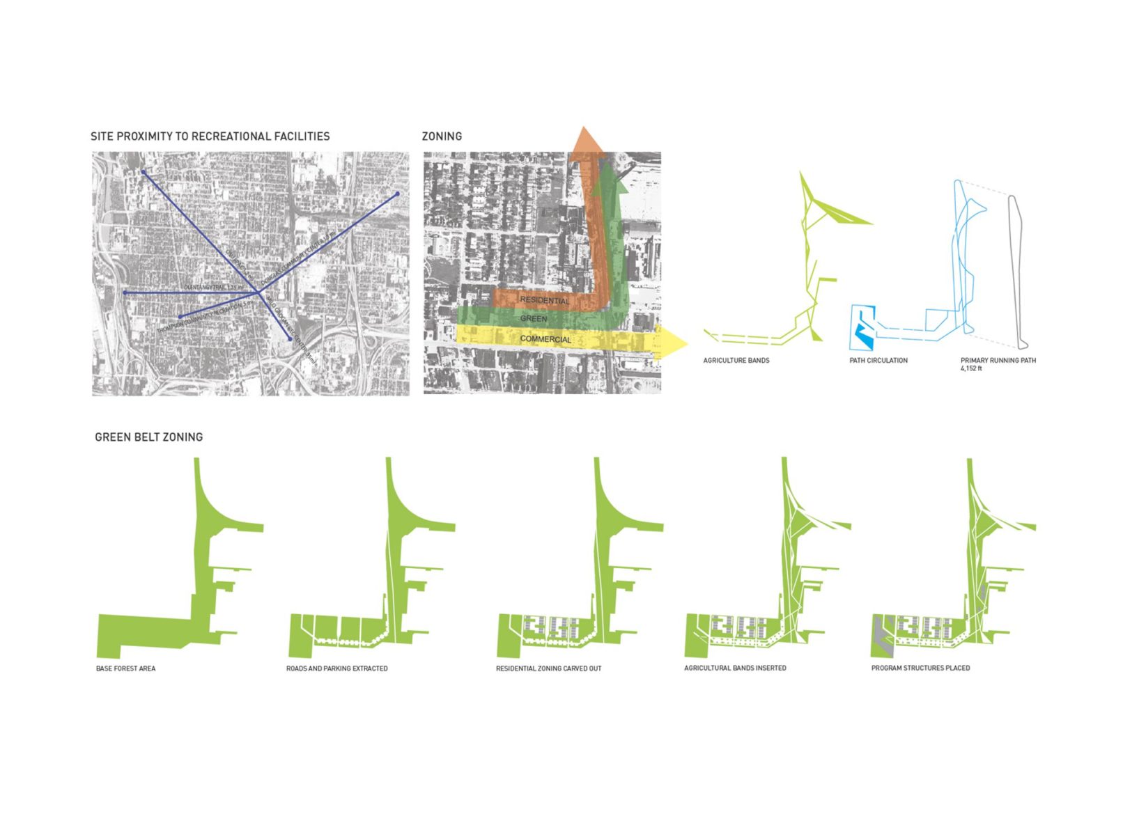 The ‘11 Gui Design Competition focused on a complex program of community amenities in the Weinland Park neighborhood of Columbus, Ohio. While the design prompt initially called for a series of community garden plots and an education center, it didn’t address several issues facing the neighborhood. This project is based on is a simple proximity diagram showing how far away WP is from the forest and recreational outdoor spaces. Farm/Forest expands the program to include forest, cultivated urban fields, a running path, and a number of much needed recreational installations.