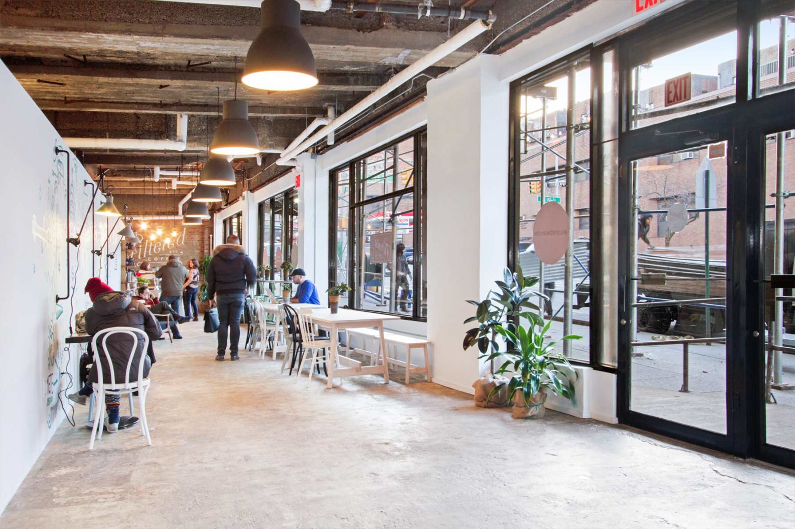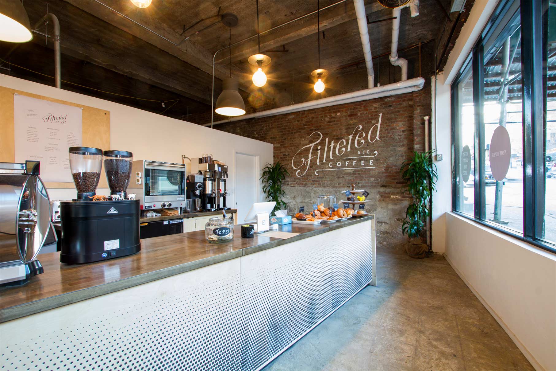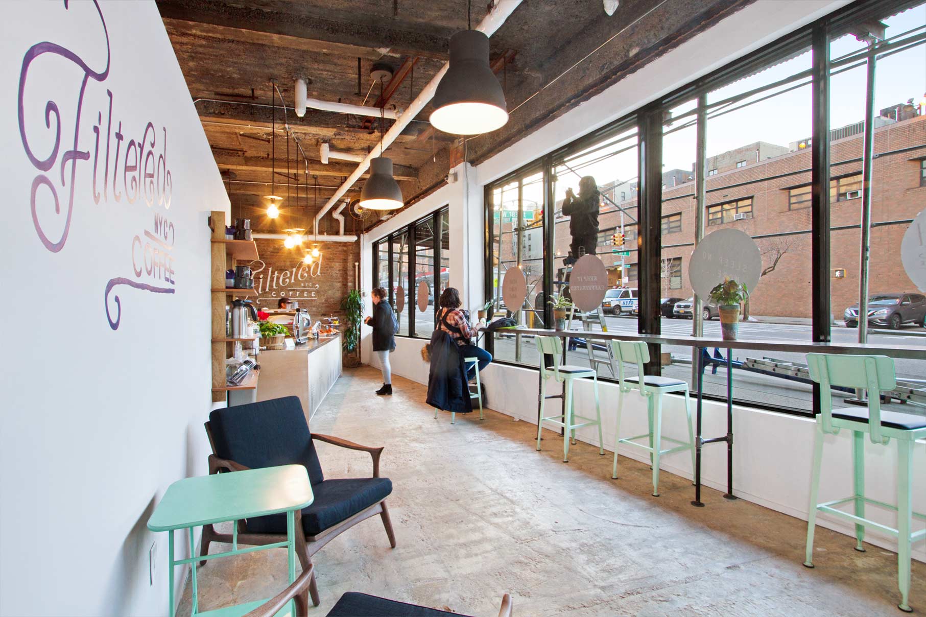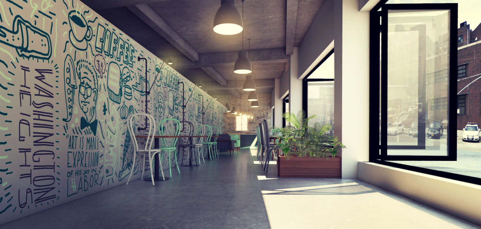 This temporary coffee shop was opened in Washington Heights while we developed a more comprehensive plan for a food market in the same location. During the planning stages of the market, the interior space was completely demolished and fitted out with an HVAC system, plumbing points, and electrical points. Seeing an opportunity in a prepped and otherwise empty commercial location, we designed a system of modular counter-tops and prep spaces that could be plugged into the new electrical and plumbing grid. The space itself was subdivided with a temporary wall that ran parallel to the storefront and was painted by a local mural artist. Industrial accent lighting was installed on surface mounted conduits and accentuated different seating elements spread throughout the space. While this shop is open for a limited time, its modular construction allows for it to be disassembled and easily moved to other locations.