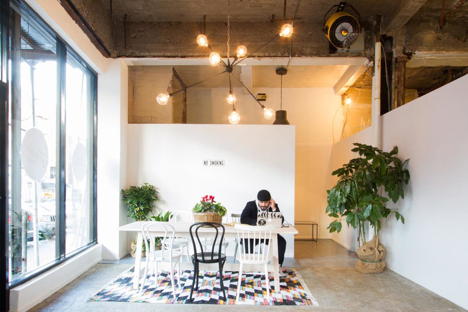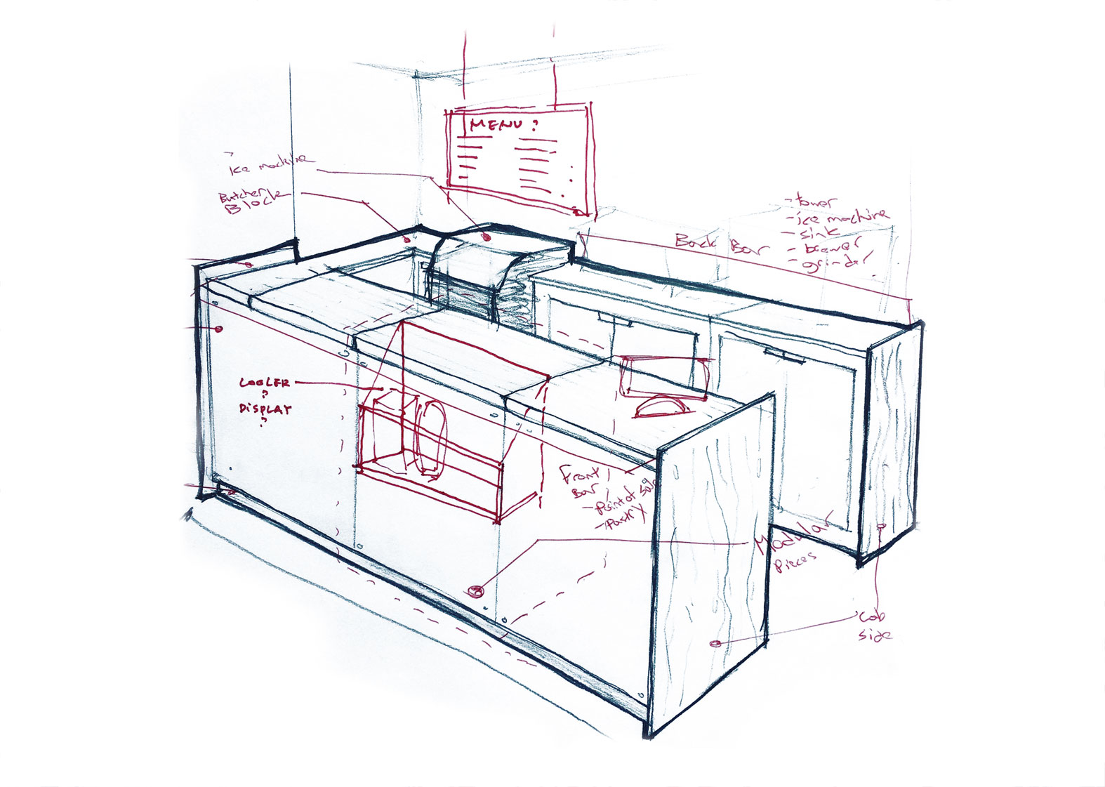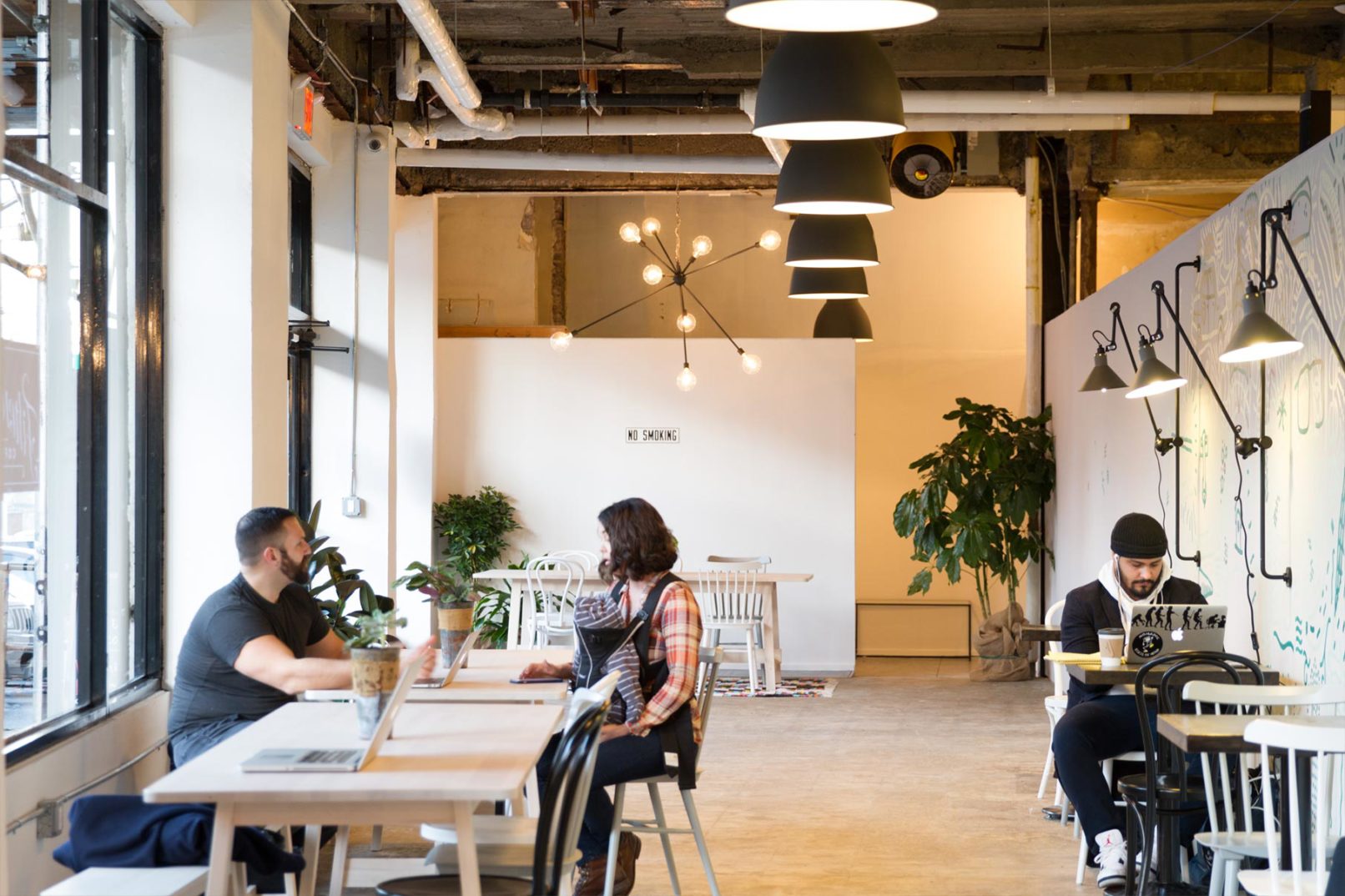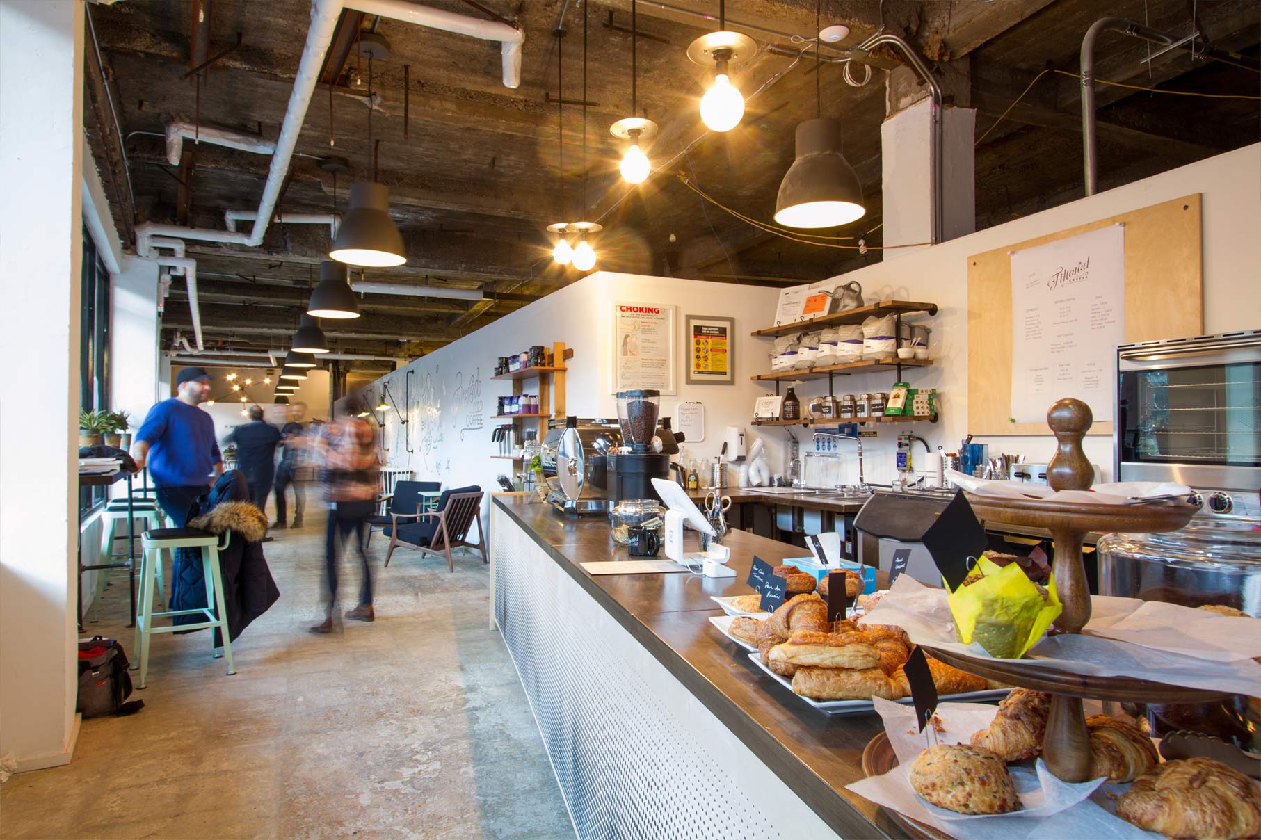 This temporary coffee shop was opened in Washington Heights while we developed a more comprehensive plan for a food market in the same location. During the planning stages of the market, the interior space was completely demolished and fitted out with an HVAC system, plumbing points, and electrical points. Seeing an opportunity in a prepped and otherwise empty commercial location, we designed a system of modular counter-tops and prep spaces that could be plugged into the new electrical and plumbing grid. The space itself was subdivided with a temporary wall that ran parallel to the storefront and was painted by a local mural artist. Industrial accent lighting was installed on surface mounted conduits and accentuated different seating elements spread throughout the space. While this shop is open for a limited time, its modular construction allows for it to be disassembled and easily moved to other locations.