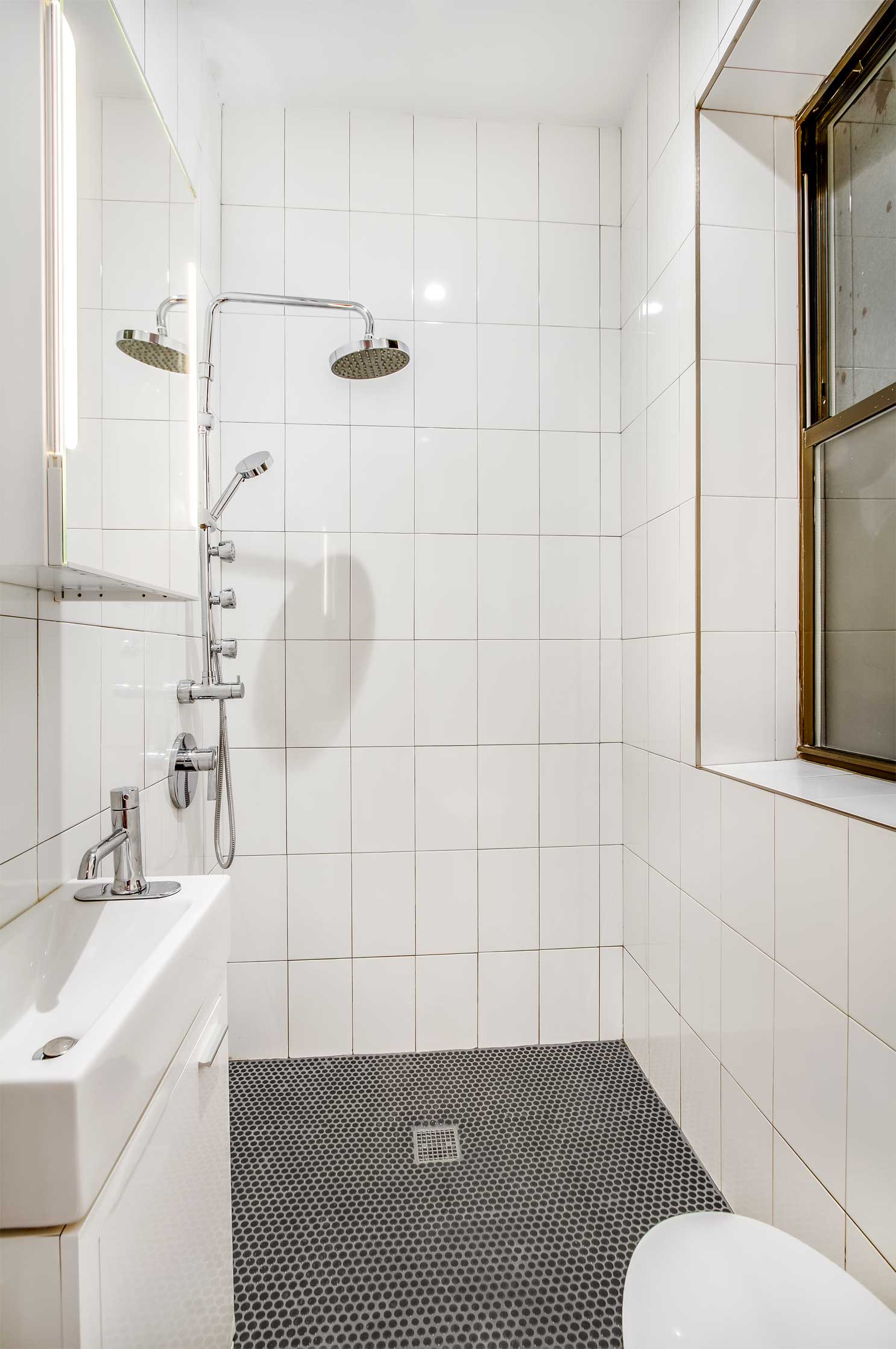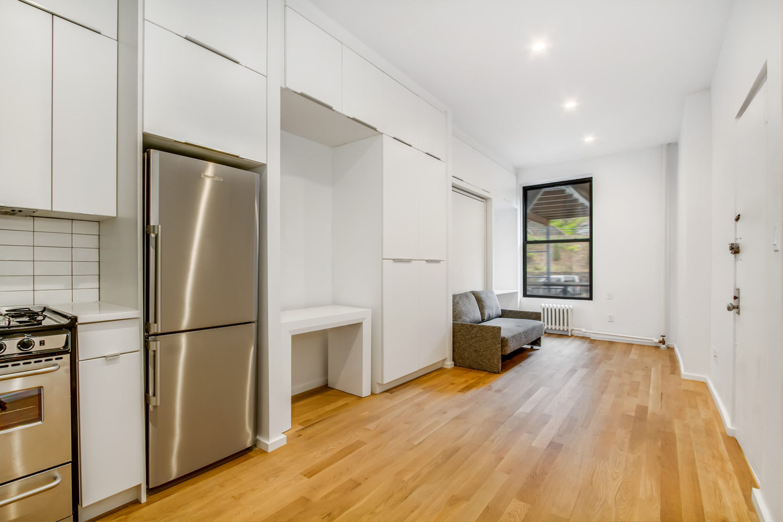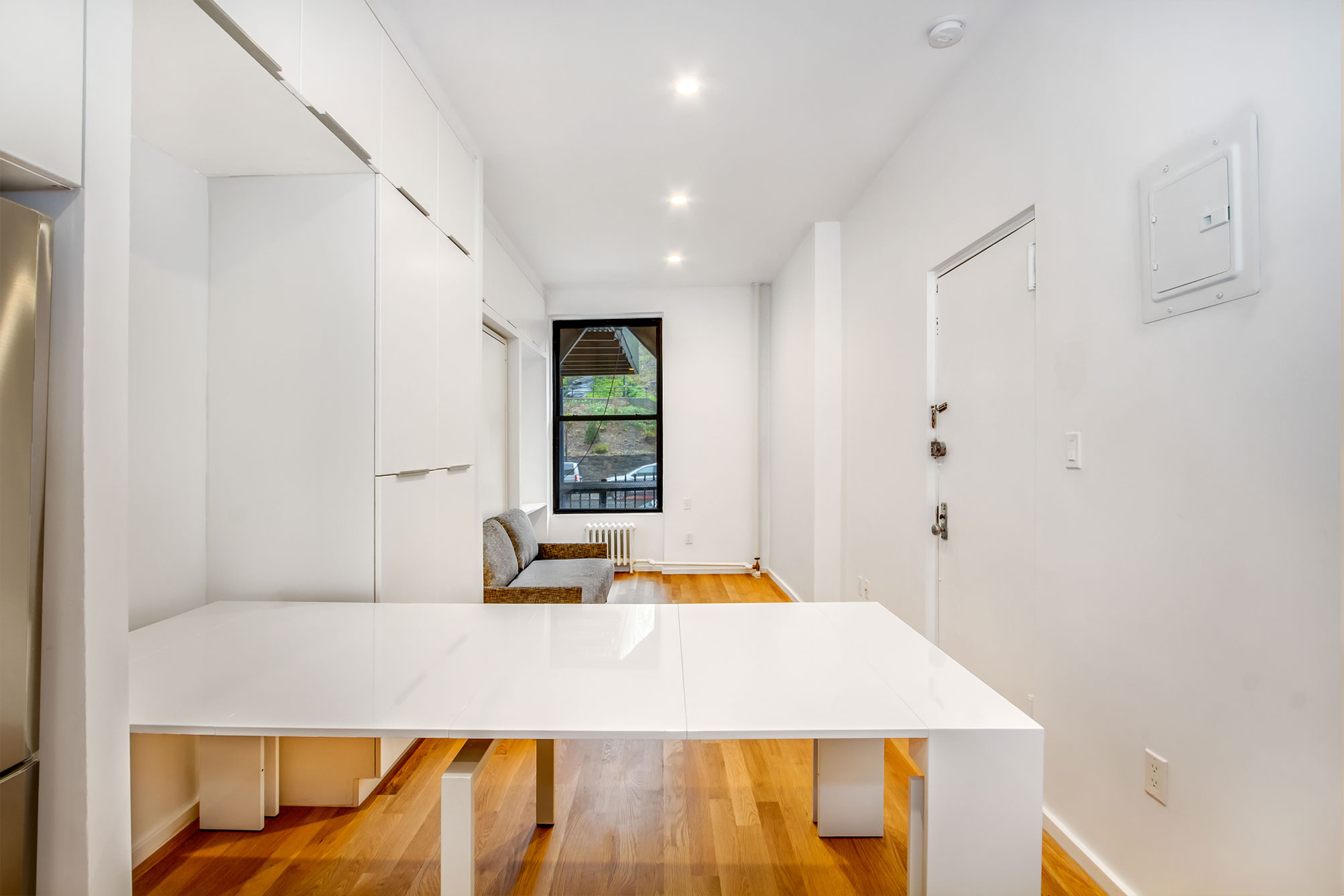 This project took inspiration from the recent NYC micro apartment initiative. Although the concepts presented in the winning proposal are a step in the right direction, they fail to address the reality of existing housing in NYC. A large percentage of apartments in NYC already fall far under the minimum standards established by the contest guidelines, and they need a diverse set of creative solutions to work within existing building footprints. This project made use of compact, transformable furniture integrated into a “swiss army” wall that allows for maximized open floor space. Windows at both ends of the apartment further link the space and highlight the open floor-plan. The cramped bathroom was redesigned with compact fixtures and a threshold-free shower. Because of this efficient packing; a bed, couch, expanding table, closet, and full kitchen can all be included within a minimal footprint.