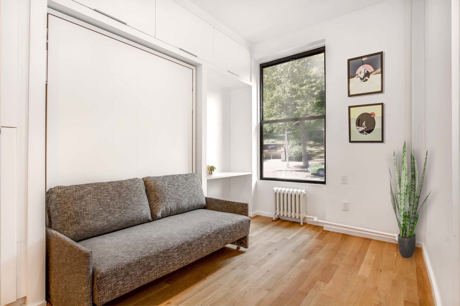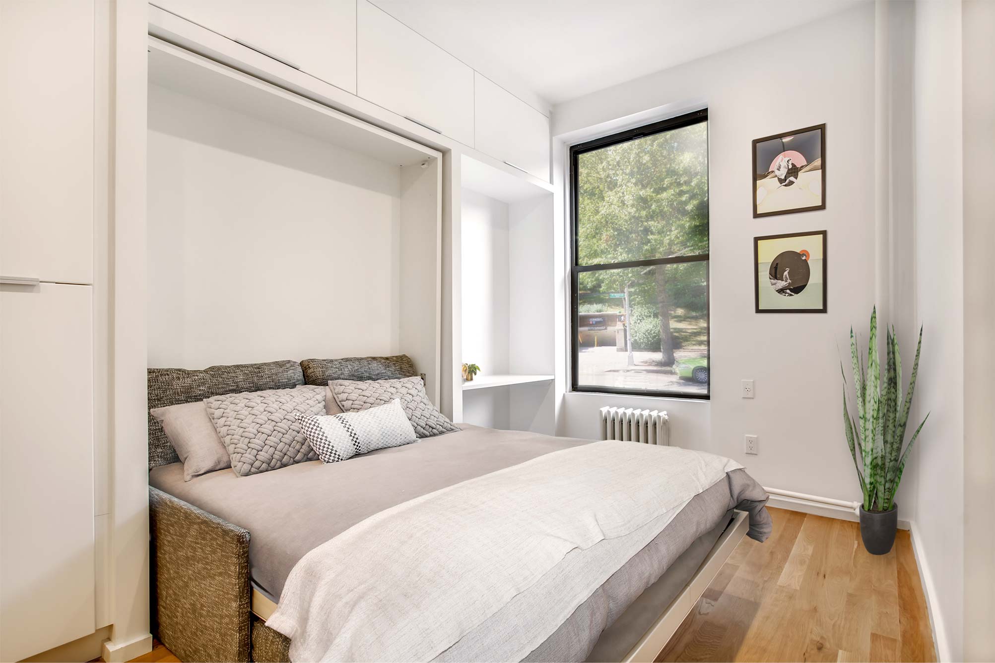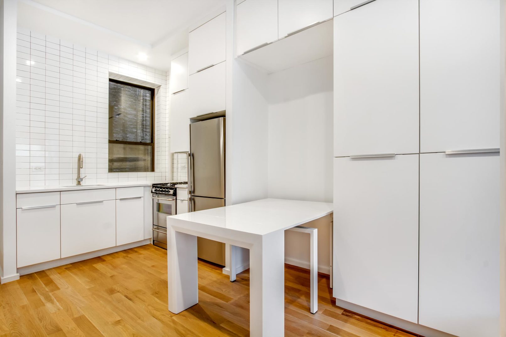 This project took inspiration from the recent NYC micro apartment initiative. Although the concepts presented in the winning proposal are a step in the right direction, they fail to address the reality of existing housing in NYC. A large percentage of apartments in NYC already fall far under the minimum standards established by the contest guidelines, and they need a diverse set of creative solutions to work within existing building footprints. This project made use of compact, transformable furniture integrated into a “swiss army” wall that allows for maximized open floor space. Windows at both ends of the apartment further link the space and highlight the open floor-plan. The cramped bathroom was redesigned with compact fixtures and a threshold-free shower. Because of this efficient packing; a bed, couch, expanding table, closet, and full kitchen can all be included within a minimal footprint.