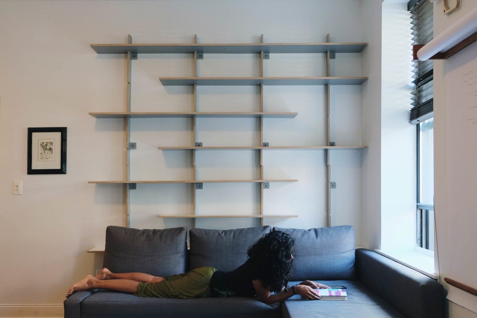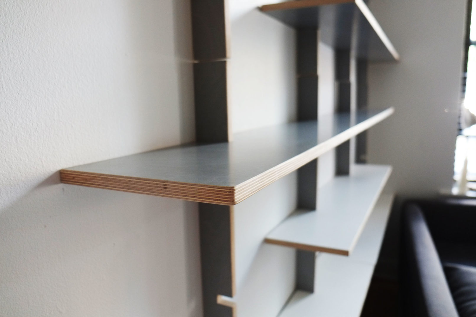 This floating wall system has series of three unique components; wall brackets, four-foot shelves, and six-foot shelves. The brackets are secured to the wall, in a predetermined grid that allows for the shelves to be placed in a number of different arrangements. Once the brackets are in place, users pick their preferred arrangement, line up the notches on the shelf and bracket, and slide the shelf into place. The shelves are made with a Koskisen Plywood with a sprayed Formica veneer and they are attached to the wall with floating drywall anchors. With the anchors in place, each shelf can hold roughly 25 pounds per linear foot.