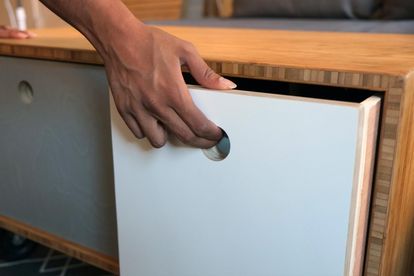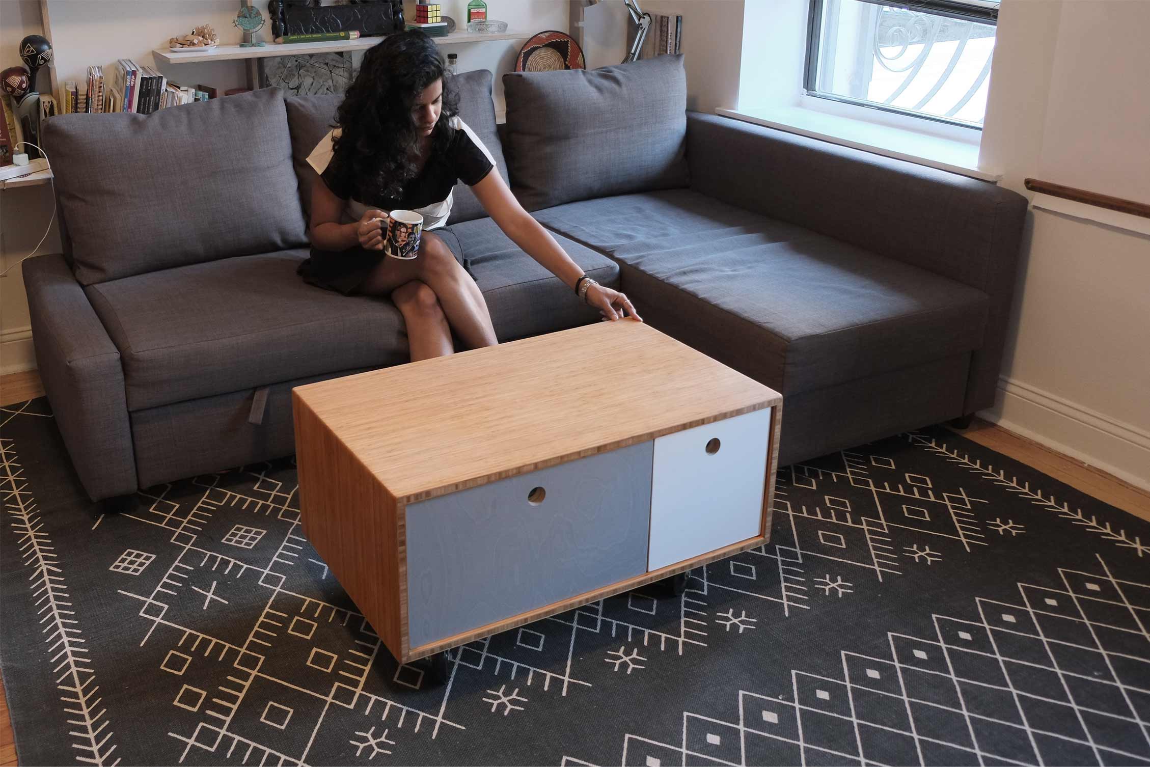 Faced with a small apartment with little storage, this table is designed to provide storage for linens as well as roll out of the way when the sofa bed is unfolded. The frame is a simple rectangle of plyboo with mitered corners. The drawers are faced with a veneered plywood that matches the wall shelves behind the sofa and finished with a single hole handle.