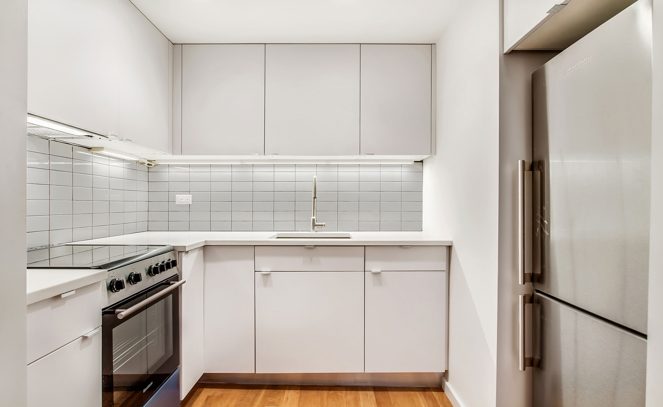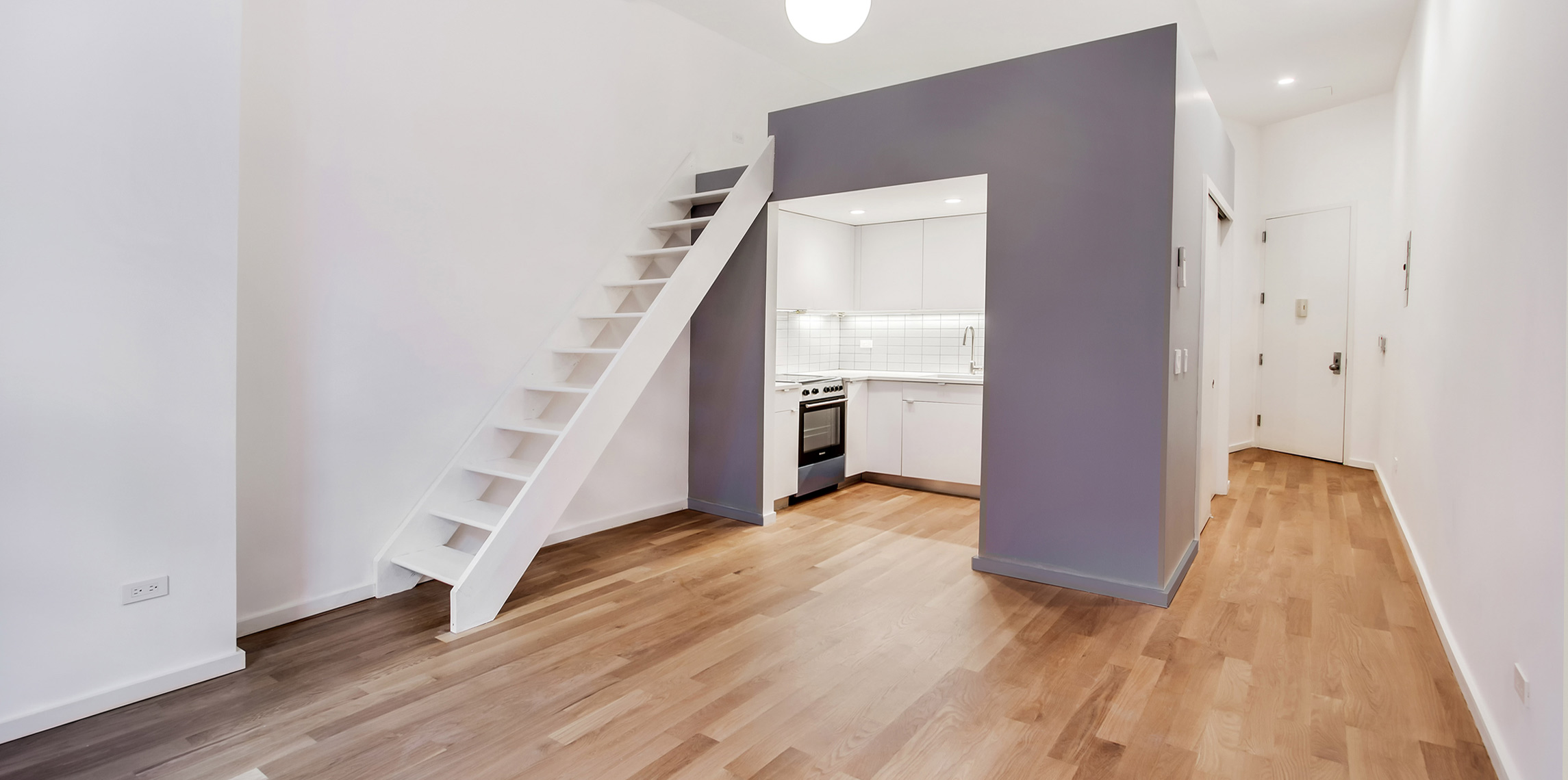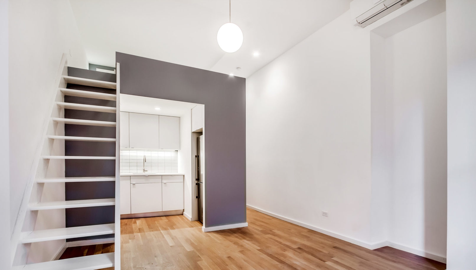 This project began as a cramped one bedroom apartment with a small space subdivided into an interior room with no light and a small adjacent bedroom. The first step in the renovation involved demolition of all interior walls and relocation of every plumbing point. The studio makes use of 12-foot ceilings to create a lofted bedroom and concealed storage area over a cube enclosing the bathroom, kitchen, and closet. The addition of the loft frees up floor space and makes the apartment feel much larger than its original size.