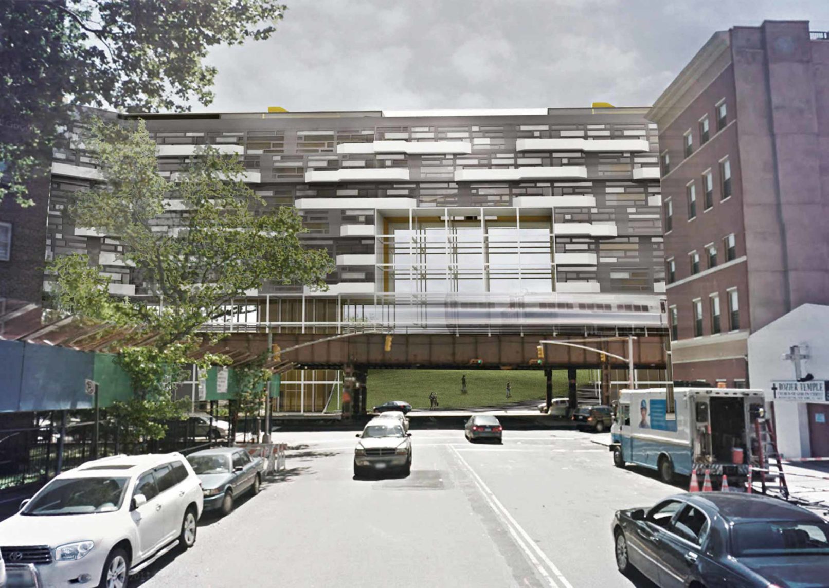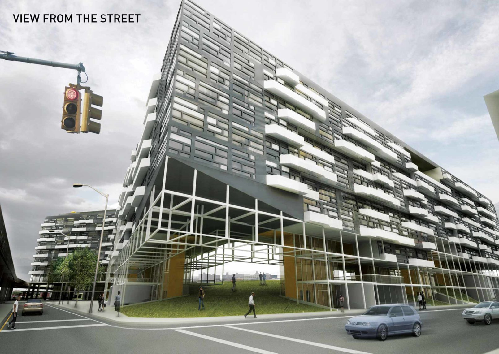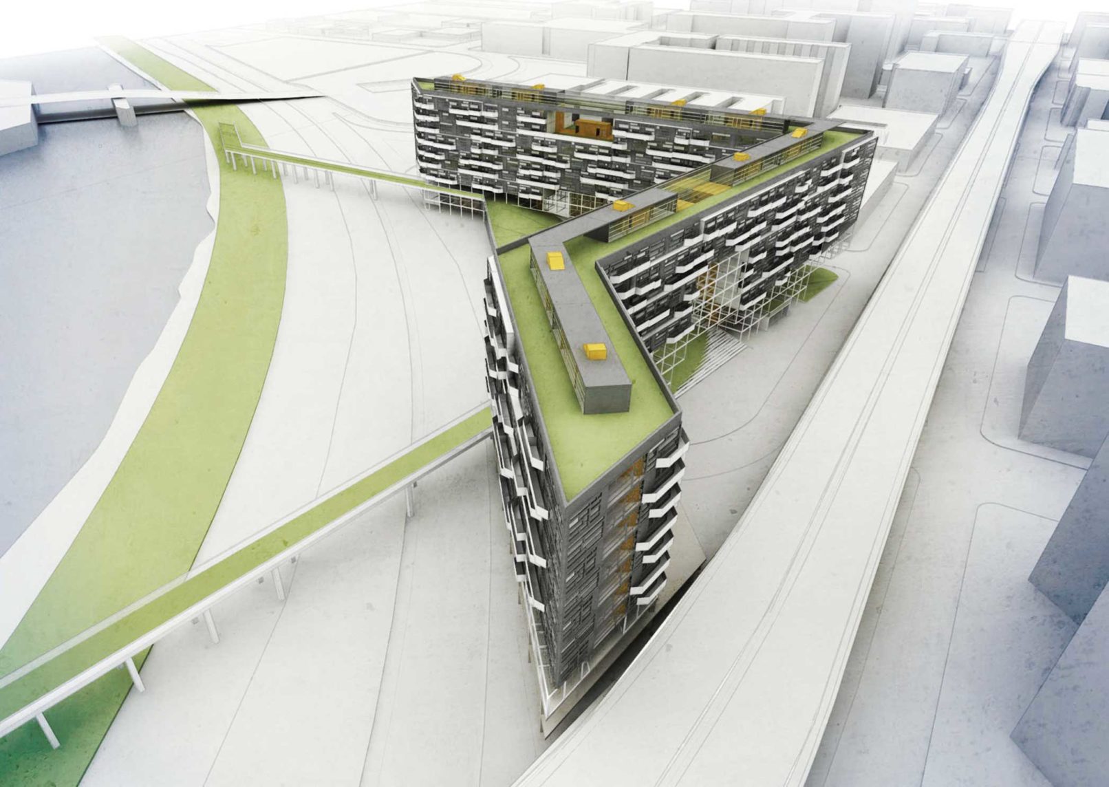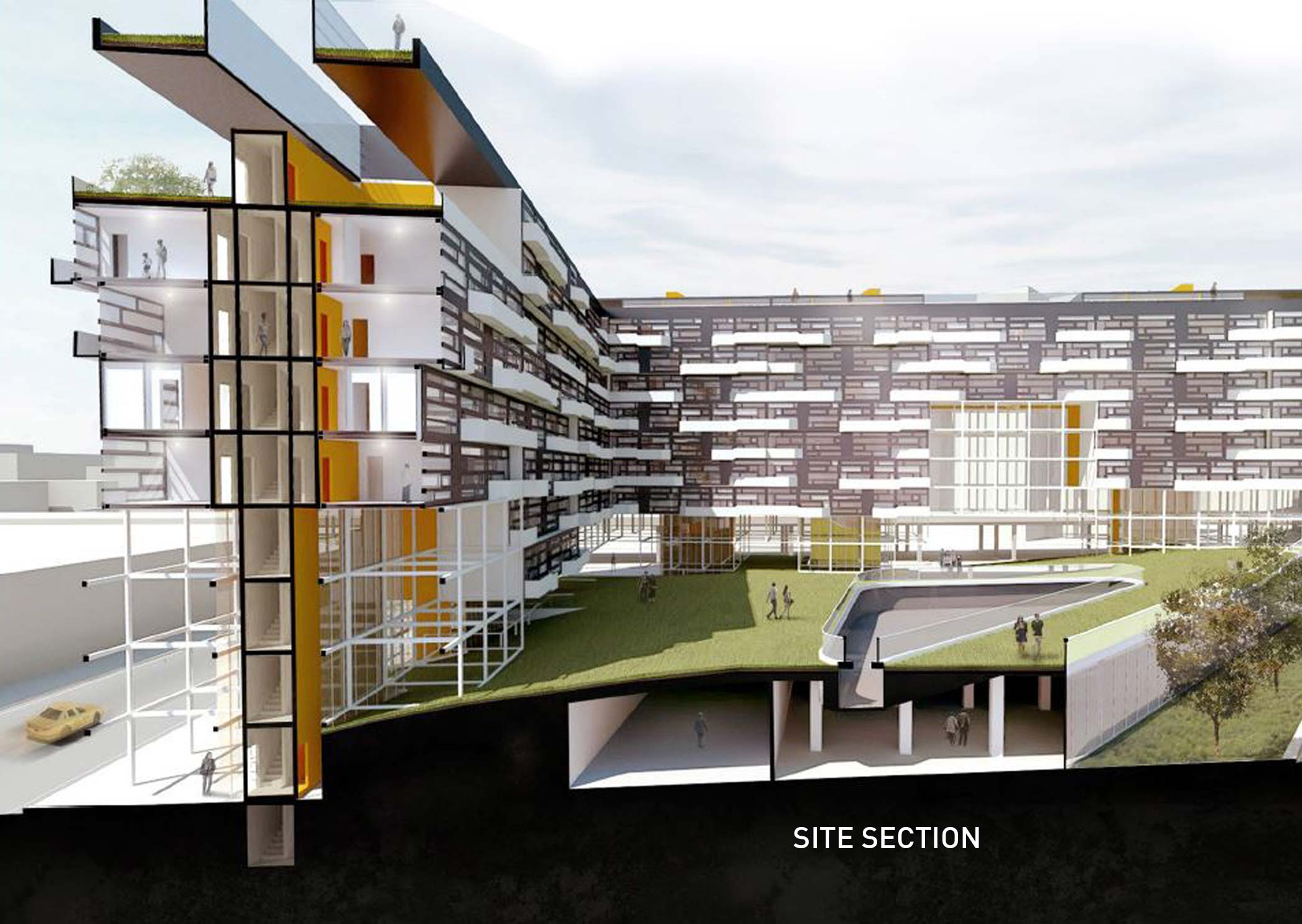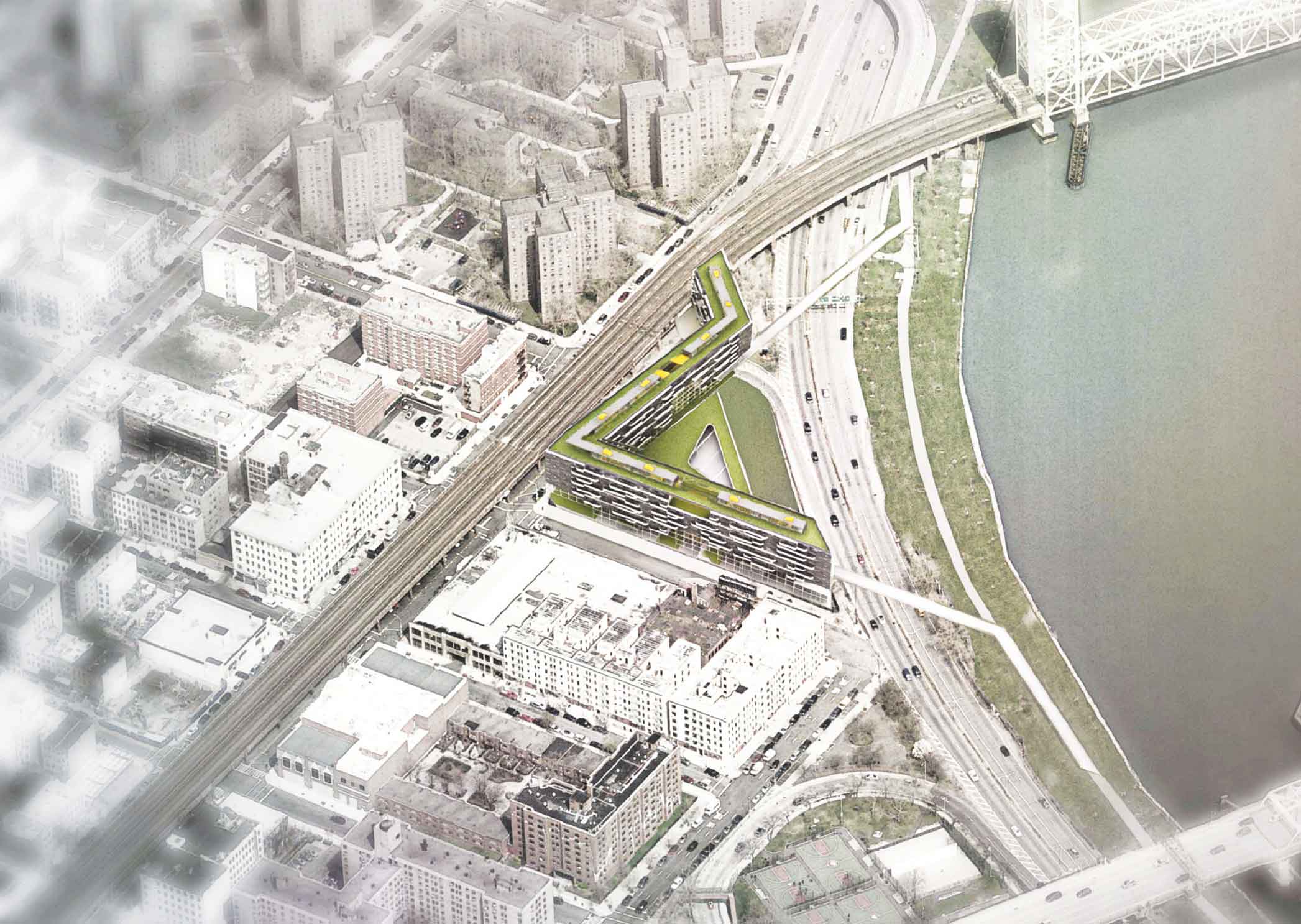 Throughout the development elevated park and outdoor spaces are created from voids in between units. The floor plan is organized around a perimeter of ground floor retail space that surrounds a gently sloping green lawn. This lawn is extended over FDR drive to connect the lawn into the existing network of green belts ringing Manhattan.
