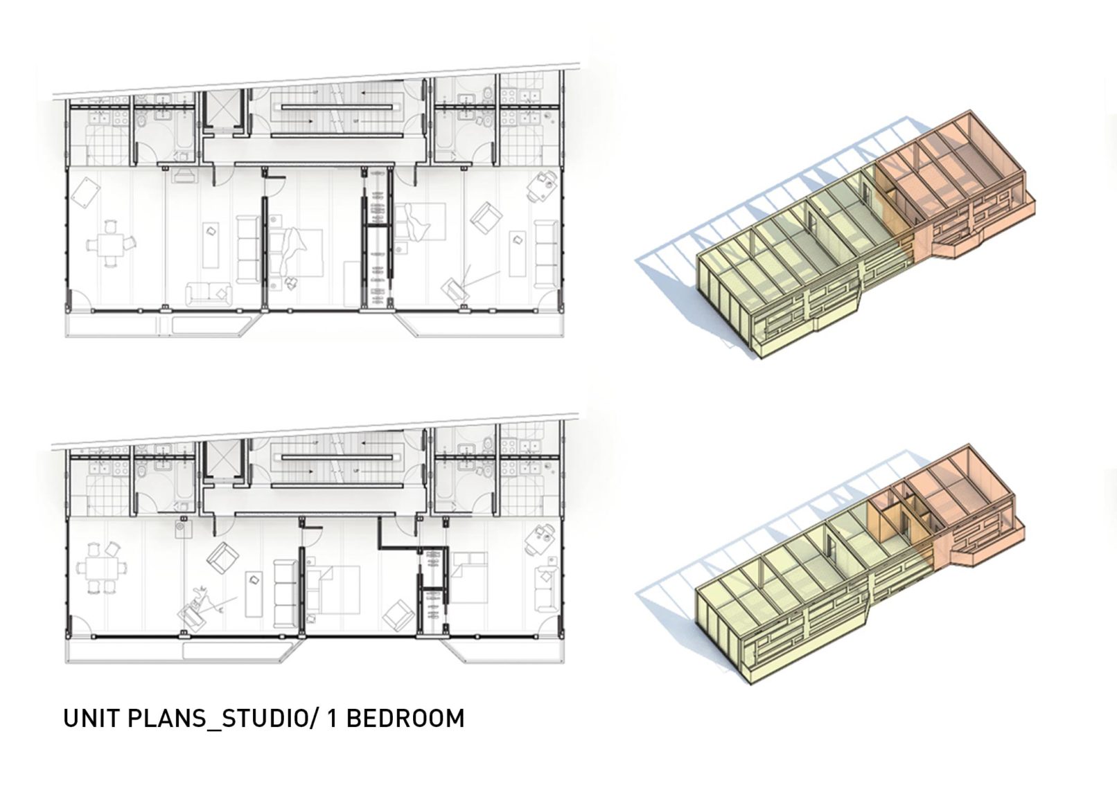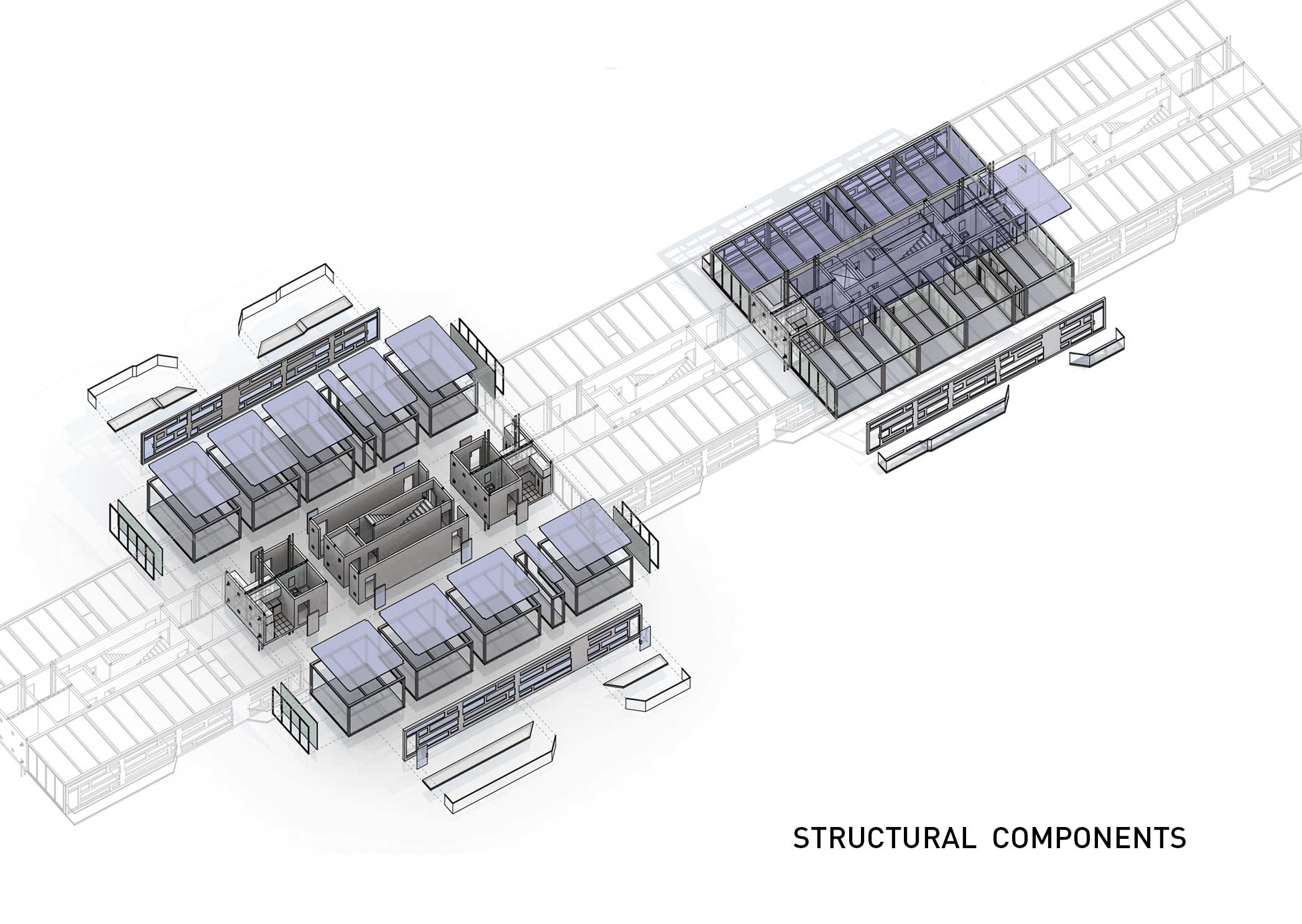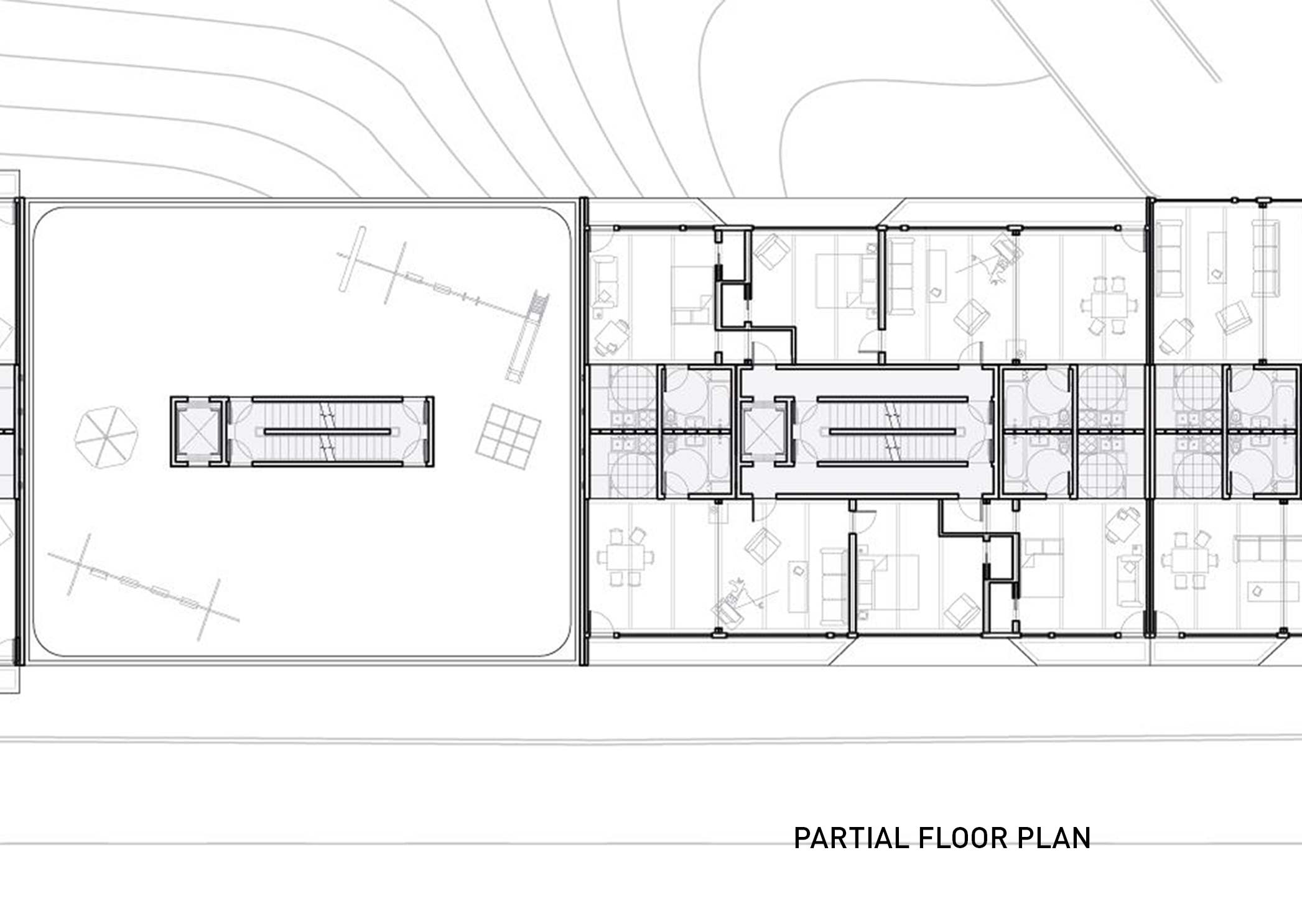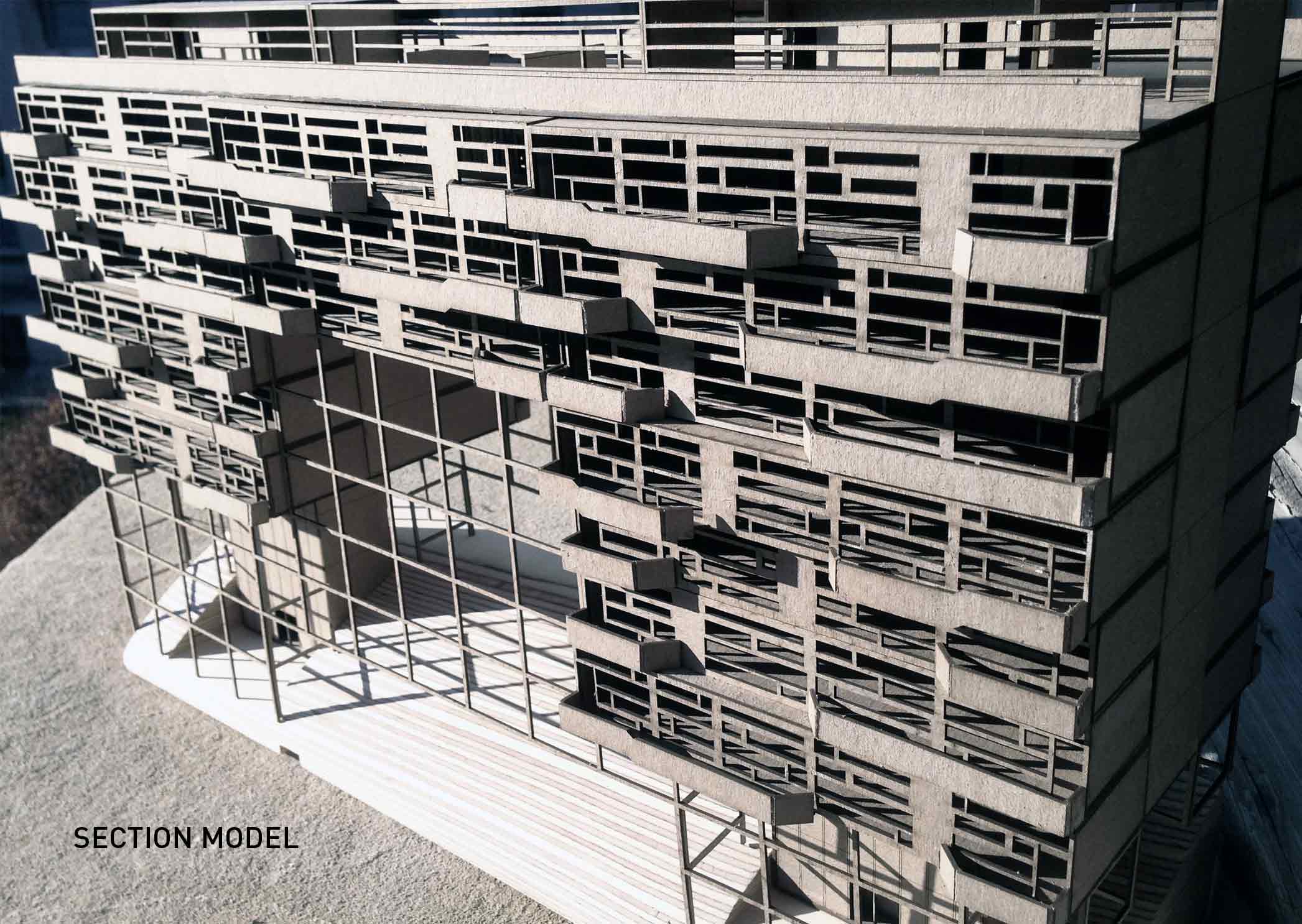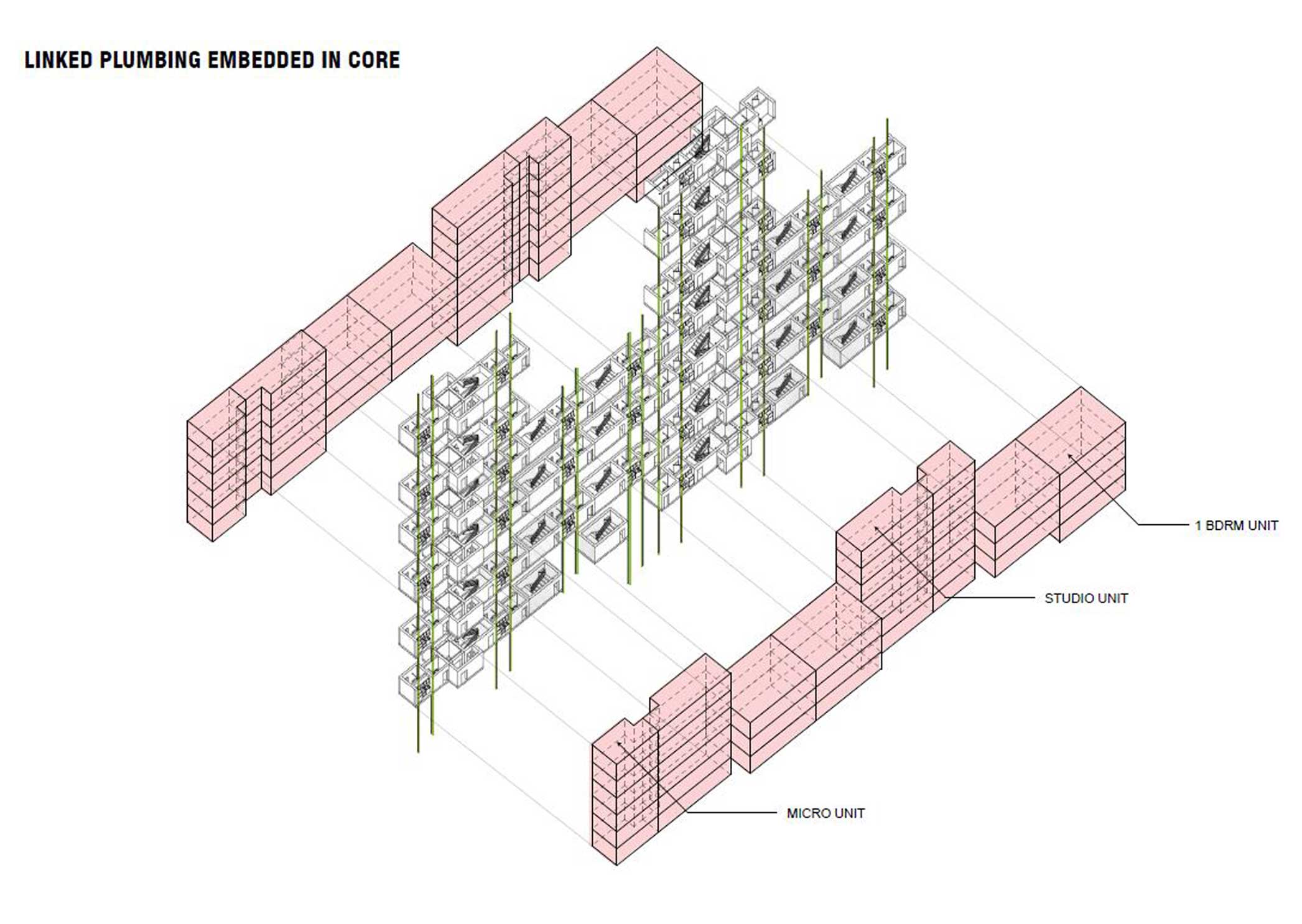 While many housing projects make use of a standard building core as a method to organize circulation and layout, Supercore re-envisions the core to maximum privacy, efficiency, and flexibility. The new core houses not only the circulatory and mechanical functions but also includes self-contained units for bathrooms and kitchens. These units are arranged to minimize the number of wet walls. All utility spaces are squeezed into the smallest footprint possible. Housing all the essential building functions in a comprehensive yet compact core allows for a large amount of flexibility in living spaces and exteriors. Using this core as an anchor, lightweight structural frames are simply attached to add living units. These prefabricated plug-in units have different layouts that aggregate to achieve the desired mix of one, two, and three bedroom apartments. Each unit is accessible by an elevator connection and a semi-private staircase.