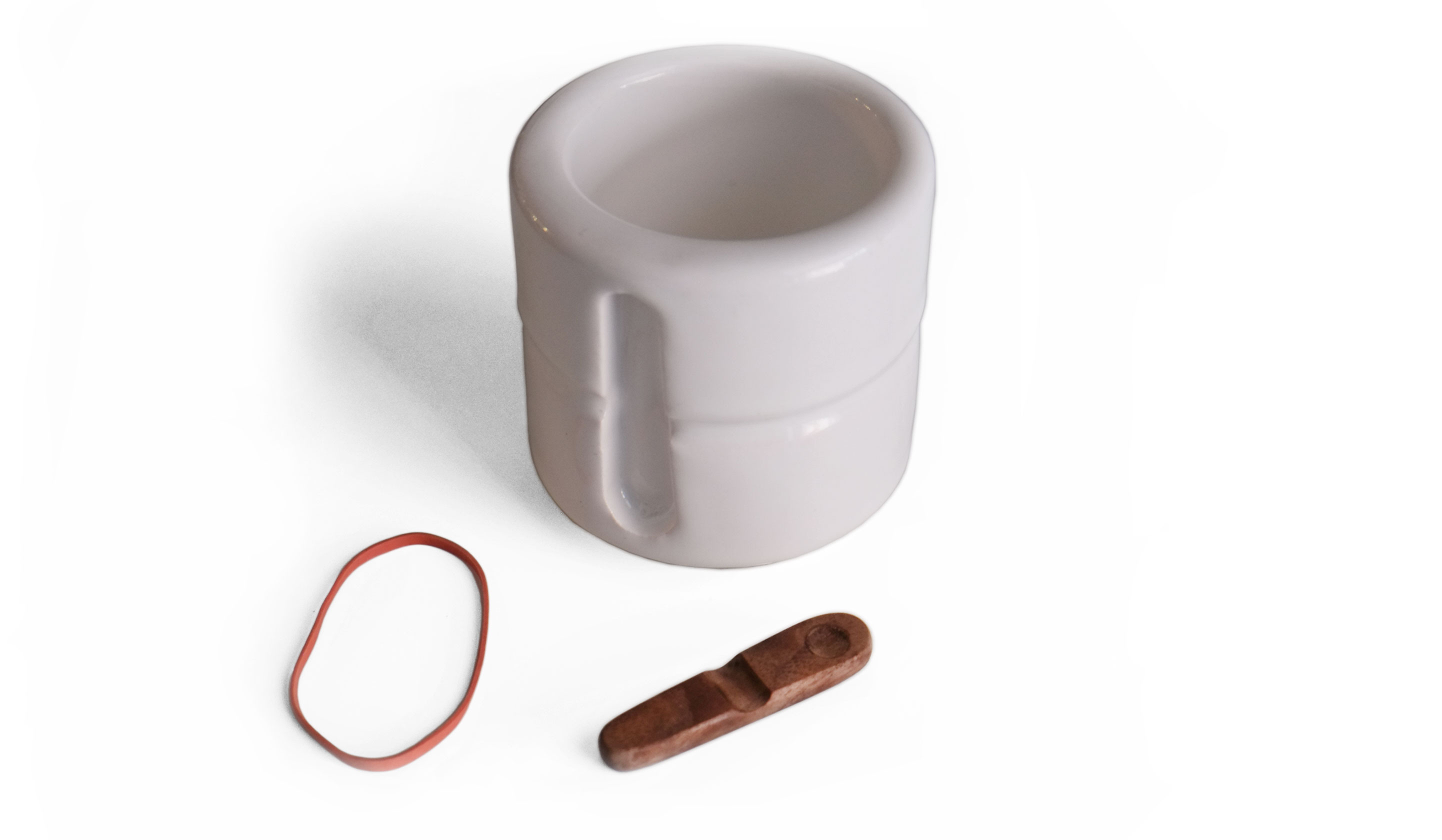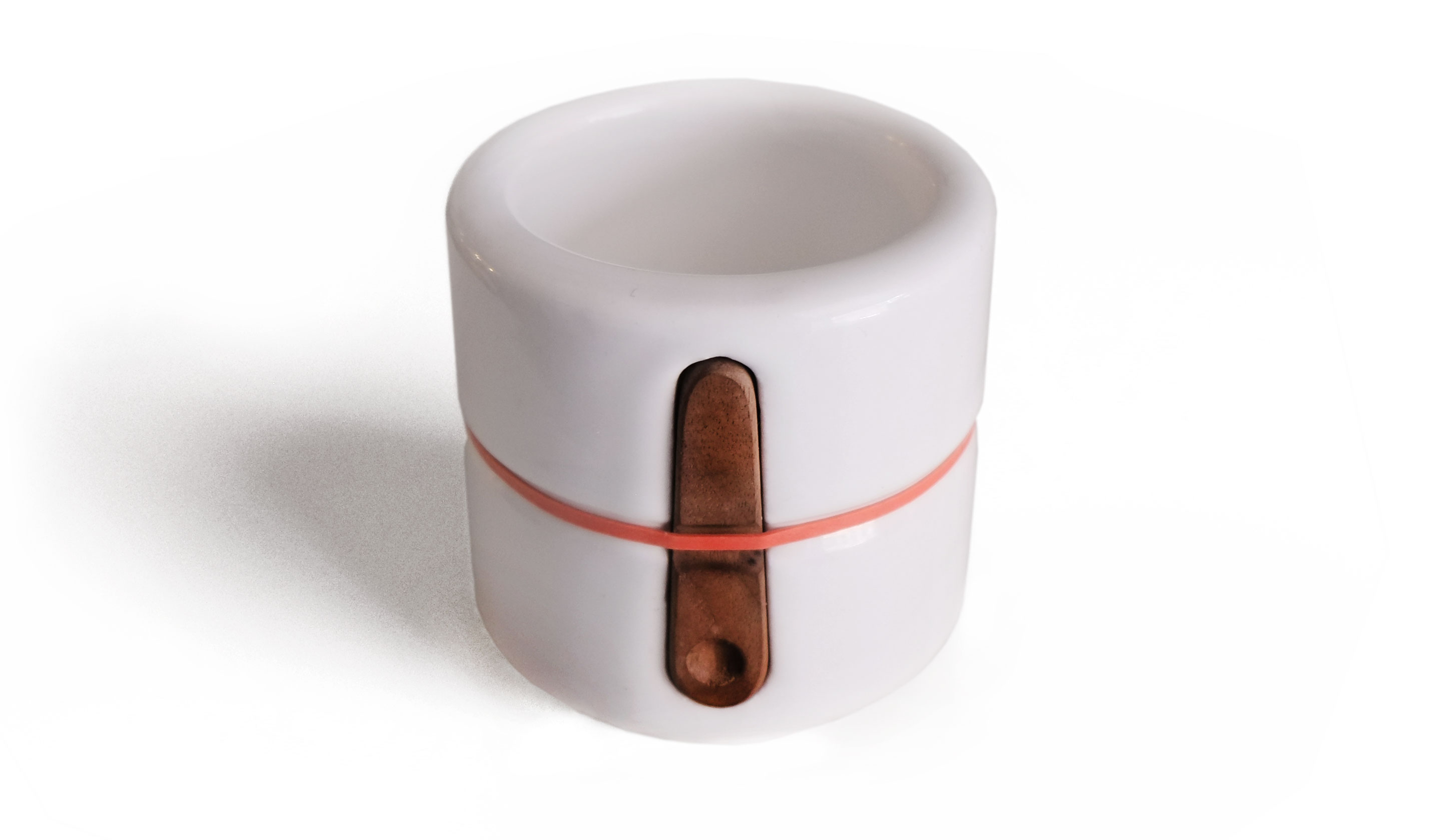 This teacup is the result of my explorations in on-demand 3D printing. A relatively simple design was created in Rhino6 then exported as a printable file to an online fabrication provider to be printed in white glazed clay. The sugar spoon was carved by hand front a piece of black walnut and is held in place with a conventional rubber band.